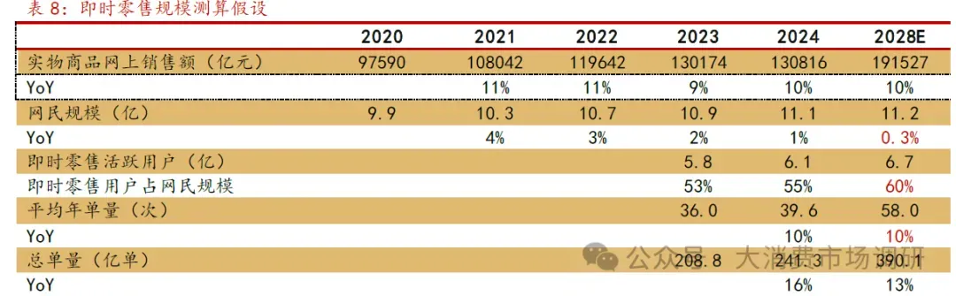 1.即时零售活跃用户:根据商务部经济合作研究院数据,2023 年即时零售用户数为5.8 亿人,占网民规模为53%,我们假设2028 年为60%。由于我国网络普及率已达到70%以上,假设2024-2028 年网民规模CAGR 为0.3%。计算得2028 年即时零售用户数为6.7 亿人。