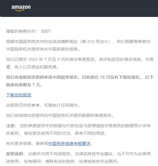 1月14日,不少亚马逊卖家后台再次收到税务相关通知。不同于卖家期待的2025年第四季度(Q4)数据,此次平台重新推送的是 2025年第三季度(7–9月)税务报告,并仅为未及时下载的卖家开放 7天补充下载窗口。