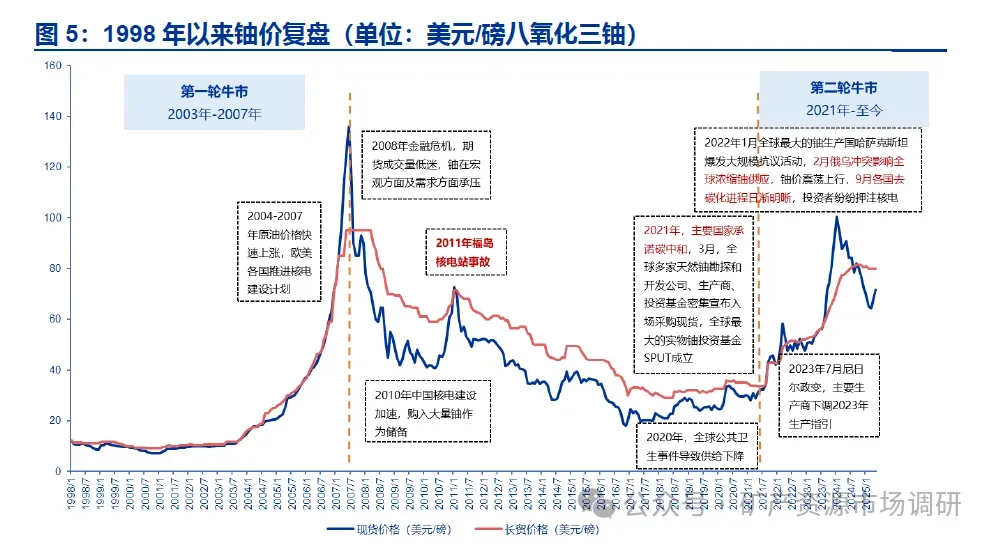 铀价主要由供需关系决定,2023 年以来铀价共经历两轮牛市,当前处于第二轮牛市中间阶段。将2003 年以来铀价走势划分为上行期、下行期及盘整期:(1)第一轮上行期(2003-2007 年):核电复苏推动铀价上行;(2)第一轮下行期(2008-2016 年):次贷危机和福岛事故造成冲击;(3)盘整期(2016-2020 年):铀价低迷抑制资本开支及产出;(4)第二轮上行期(2021 年-至今):经历前十年的铀矿勘探资本开支低迷,铀矿供应已逐渐紧张,随着全球碳中和政策推进,核电作为稳定的清洁能源迎来需求复苏,铀价进入新一轮上涨周期。