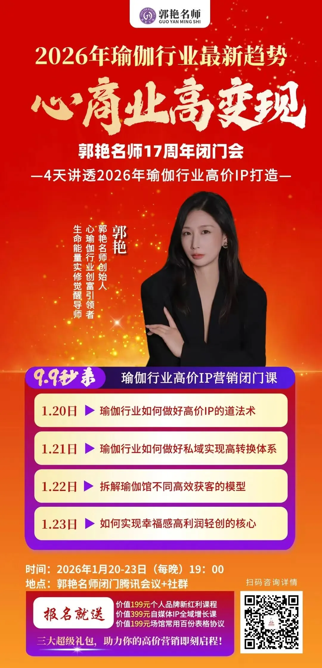 17周年闭门会,我们带着17年的实战干货而来——高价IP打造、私域转化秘籍、获客盈利模型、跨界前沿技术,全是能直接落地的硬核内容。2026年,想在瑜伽心商业赛道实现高变现,这场闭门会,就是你不能错过的机遇。