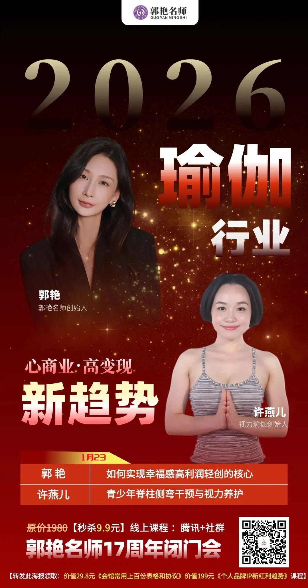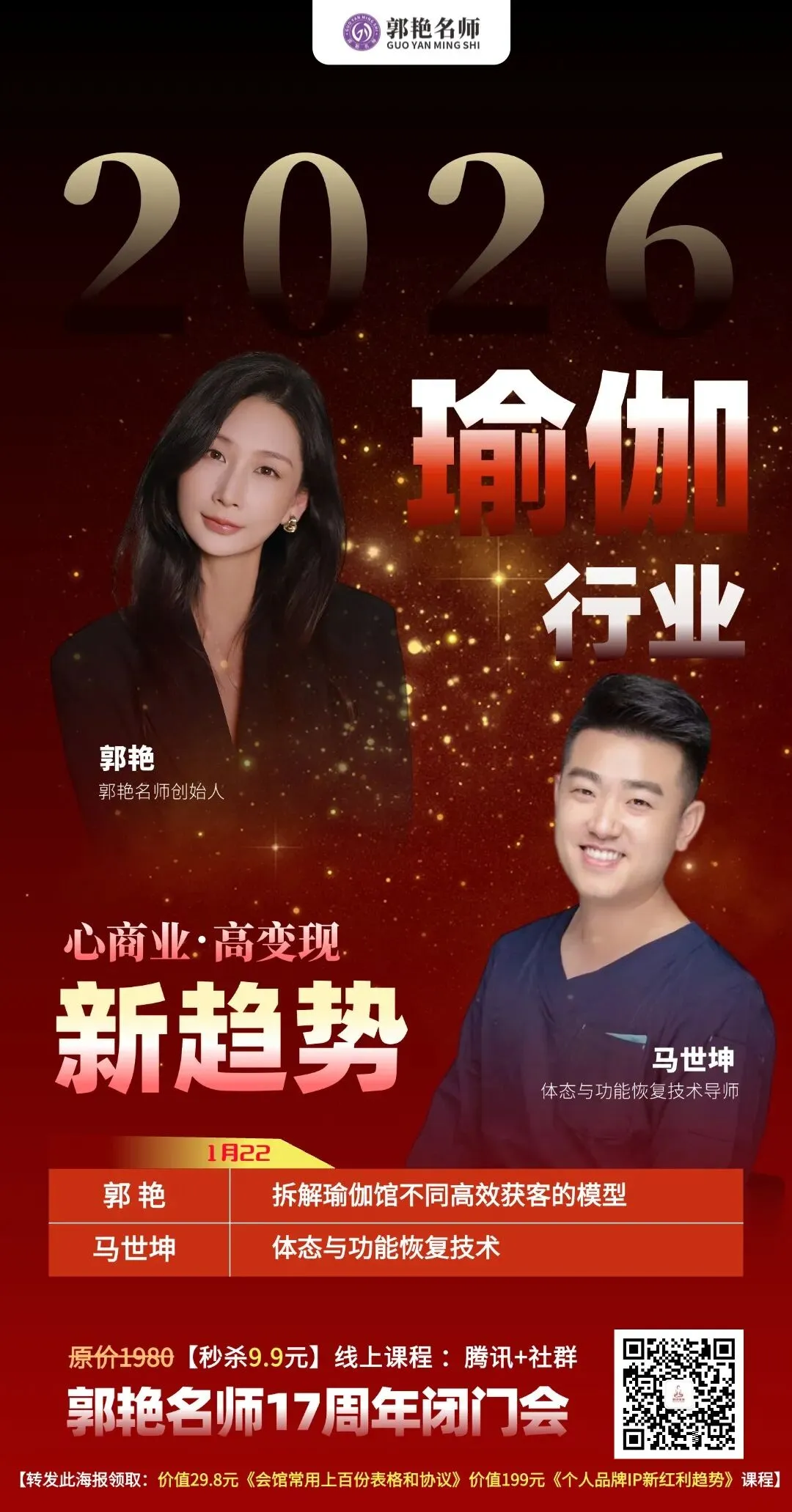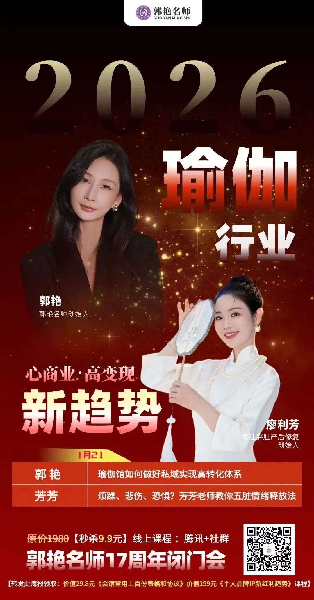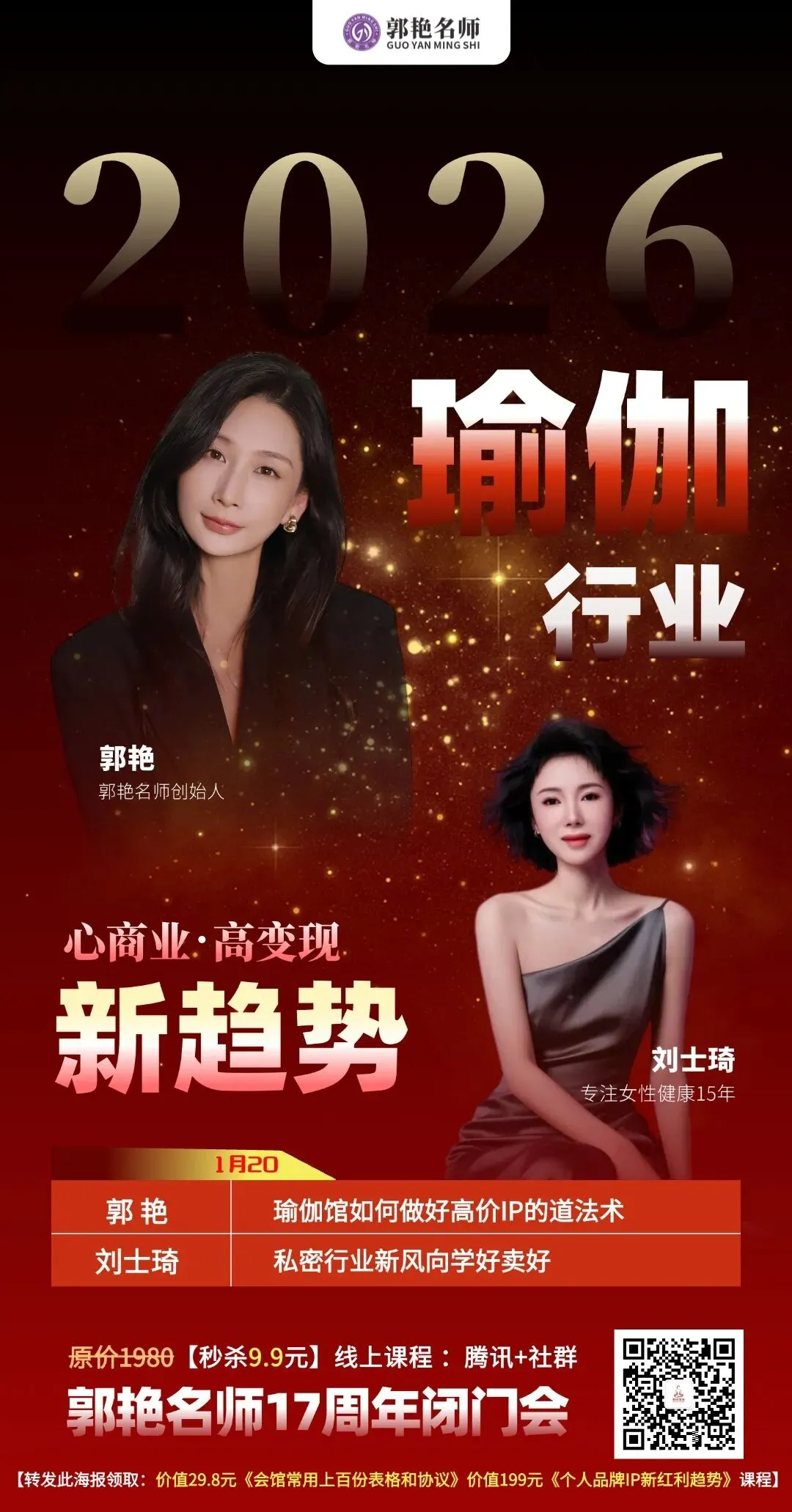 郭艳名师17周年闭门会,我们还集结了刘士琦、廖利芳、马世坤、许燕儿等瑜伽行业各领域的重磅嘉宾,从管理运营到硬核技术,全方位拆解2026瑜伽行业最新趋势,帮从业者少走弯路,找准盈利方向。