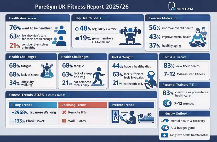 PureGym 已连续第四年发布《UK Fitness Report》,系统性追踪英国公众在健康、健身与生活方式方面的态度变化。PureGym 在报告中明确指出,作为一家低价健身房连锁,其会员结构并不能完全代表英国整体人口,因此本研究并非基于单一内部样本。