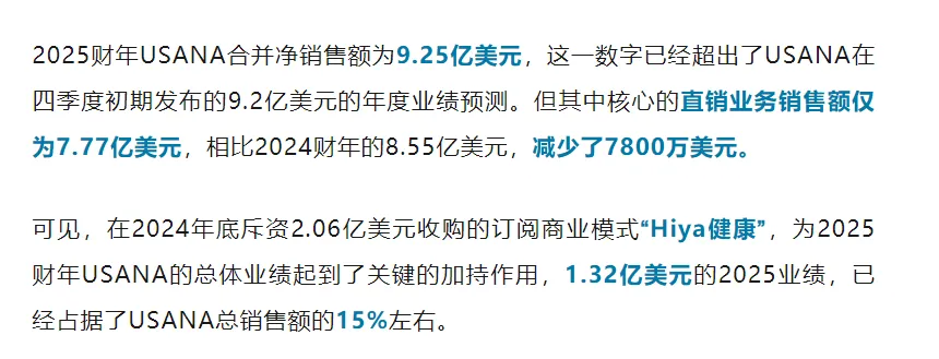 13日,USANA优莎纳公布了2025财年的初步财报数据,订阅模式稳步提升,核心直销业务下滑。2025财年,USANA净销售额9.25亿美元,2026年,USANA将这一数据瞄准了10亿美元大关…