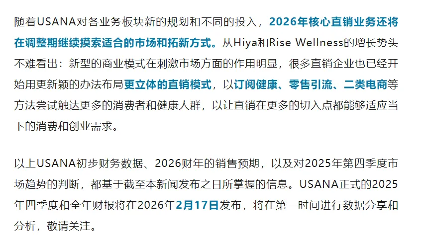 基于Hiya和Rise Wellness的增长势头,2026年,USANA还将对这两家公司进行了大规模的投资,包括库存建设、资本支出以及其他营运资金方面的投入,旨在支持这些业务在早期的发展阶段能够有足够的实力抢占市场。