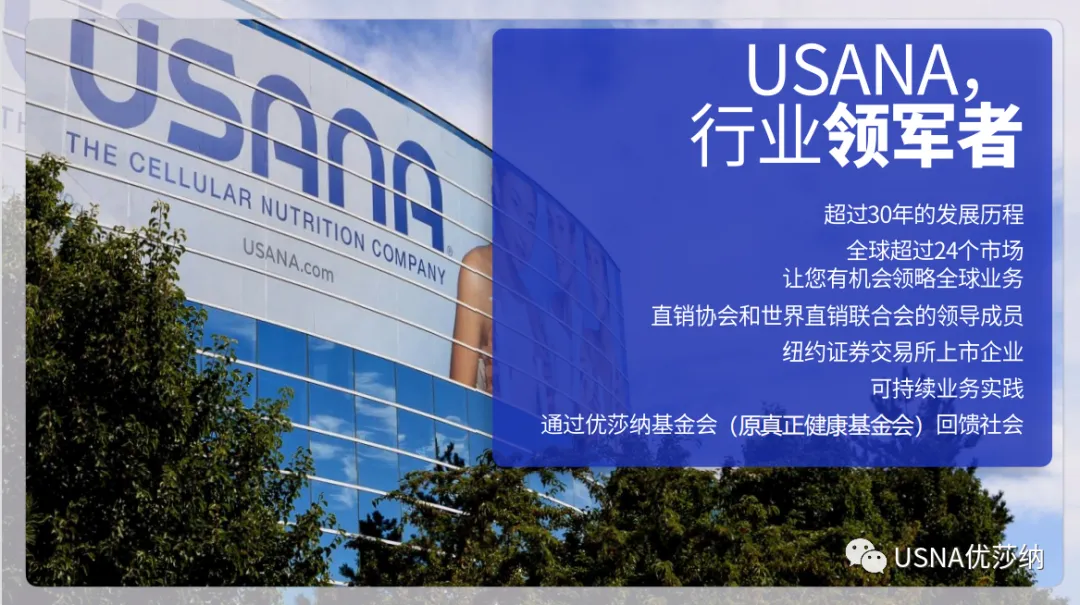 USANA(纽约证券交易所代码:USNA)细胞营养公司成立于1992年, 公司总部及工厂位于美国盐湖城,专注于为全球消费者生产高品质的营养补充品、个人护理产品和健康产品,是细胞营养领域的尖端制造商。了解详情,请访问公司官网:www.usana.com微信公众号:USNA优莎纳获取权威科学健康资讯,请访问“询问科学家”网站:https://askthescientists.com/zh-hans
