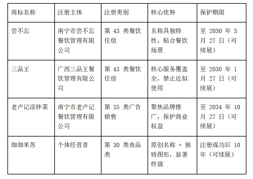 (老卢记凉拌菜作为地方特色凉拌菜品牌广为人知,是南宁市老卢记餐饮管理有限公司于20230317日申请注册,类别是第35类广告销售,代理机构为北京峰骏国际知识产权代理有限公司。它的核定使用服务包括广告宣传、广告设计、商业管理和组织咨询、商业管理辅助、外包服务(商业辅助)、提供商业信息、为他人推销、为他人采购(为其他企业购买商品或服务)、市场营销、计算机数据录入服务等(但商业推广与品牌管理服务为其核心使用场景)。依据《商标法》,注册人对该商标在第35类核定服务上享有专用权,受法律保护,他人未经许可不得在相同或类似服务上使用相同或近似商标。目前专用权期限至20341027日,期满可续展。)