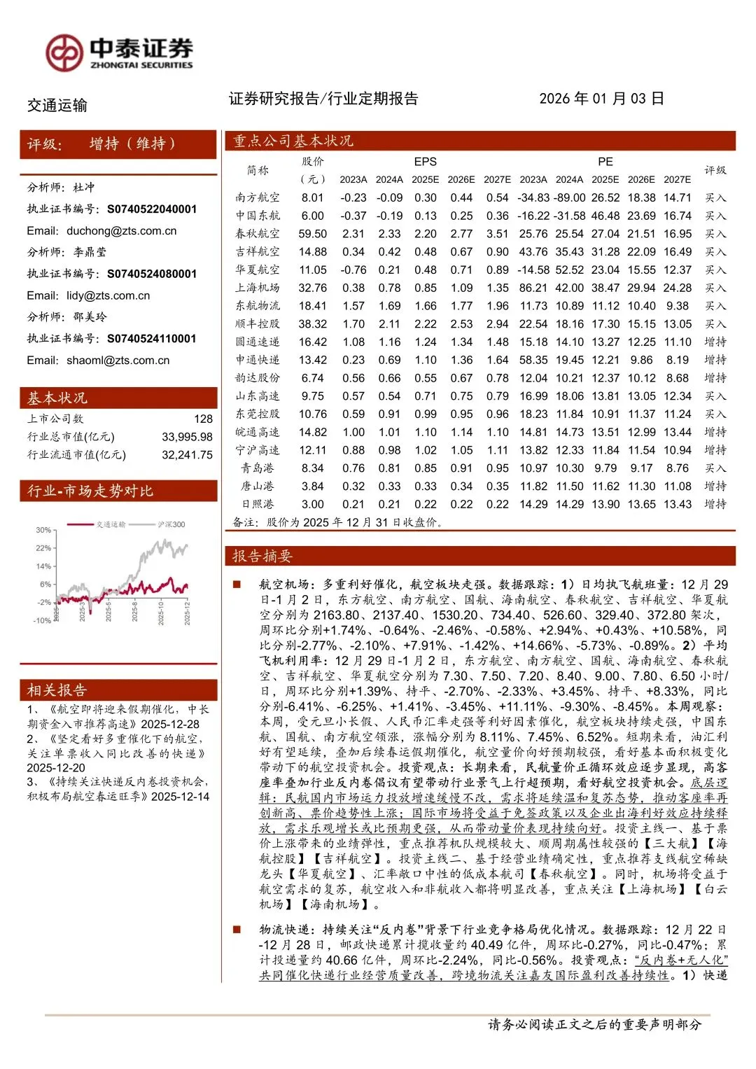 回复暗号:交通运输行业:持续看好航空旺季投资机会,再提示公路高股息配置价值-260103-中泰证券-24页