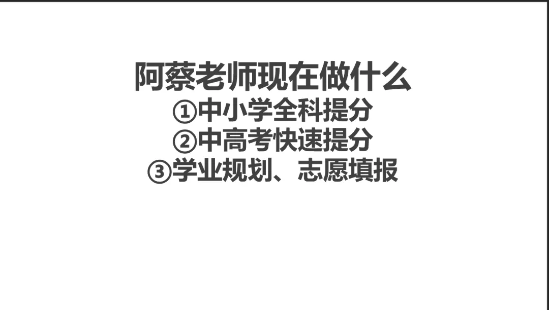 2024年5月阿蔡老师从事中小学全科提分,中高考提分,刚开始就是因为孩子英语不好,2026年6月,阿蔡老师儿子马上要中考了,让儿子考个好高中比赚一百万更重要,今年阿蔡老师上半年的重心就是帮助陪伴孩子,争取晚上抽出一小时陪孩子学习,周末抽出半天帮助孩子提分。