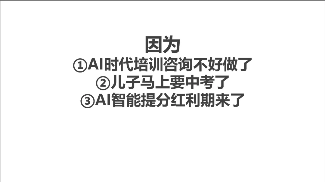 AI智能时代来了,AI提分红利期来了,人这辈子至少得抓住一次红利期,阿蔡老师好歹是浙大计算机学院毕业的,总得从事跟计算机有关联的业务,而AI提分是目前最符合阿蔡老师的需求的。