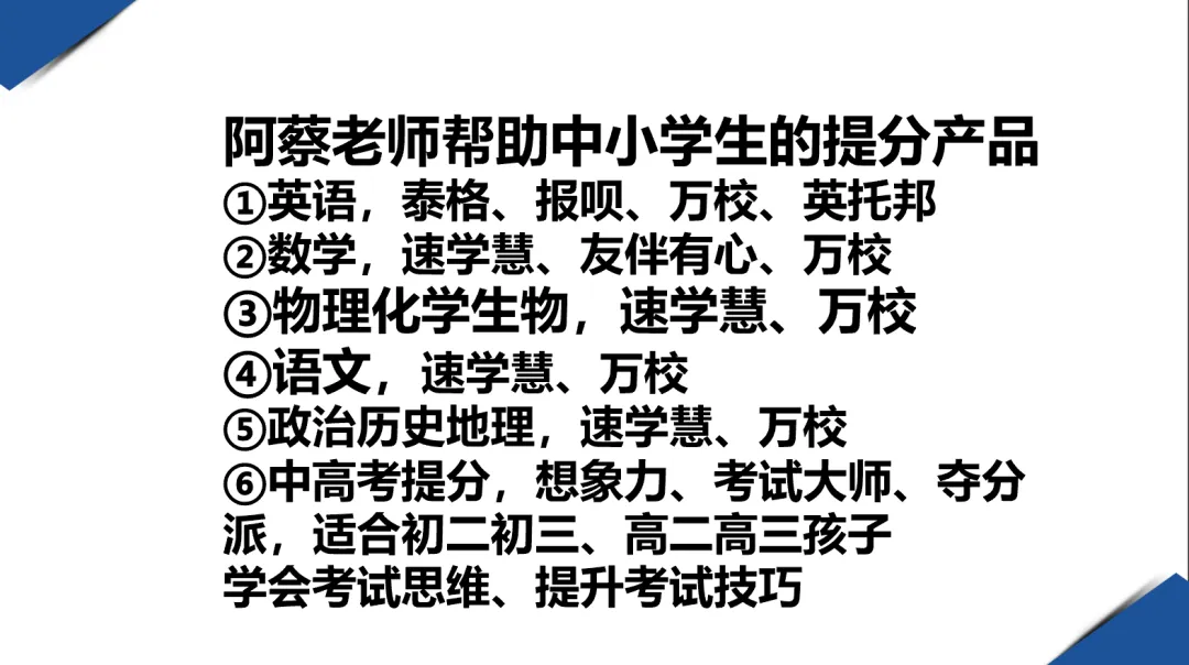 阿蔡老师代理了市面上比较靠谱的提分平台,很多人觉得阿蔡老师代理的产品太多了,其实阿蔡老师是用户思维,用户需要什么就提供什么样的产品。会给孩子做测试,了解孩子的真实水平,查漏补缺,真正做到量身定制,因材施教,专属方案。