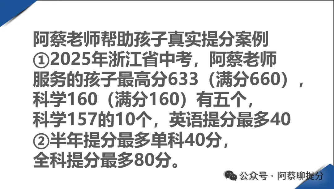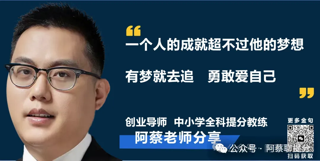 作者简介:阿蔡老师,创业导师、中小学提分教练、中高考全科提分教练,宁波人,定居在杭州,2003年毕业于浙江大学计算机学院。带领团队已经帮助上百个孩子英语、数学等三个月提分20起,目前正在帮助几十个中高考孩子提分,期待大家2026年中高考成绩的提升。