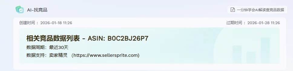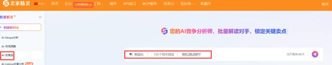 用卖家精灵AI解读—AI找竞品功能输入ASIN:B0C2BJ26P7,选择美国站,150个相关产品(目前最高支持150)