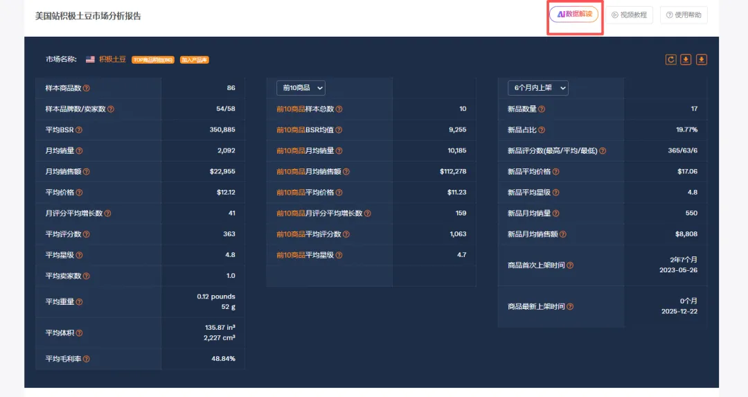 等待几分钟即可得到AI打标过的竞品表格,打开看详细数据,表格可下载,点击右上方加入产品库,可新建一个自己命名的产品库再提交(这里我的命名是积极土豆)