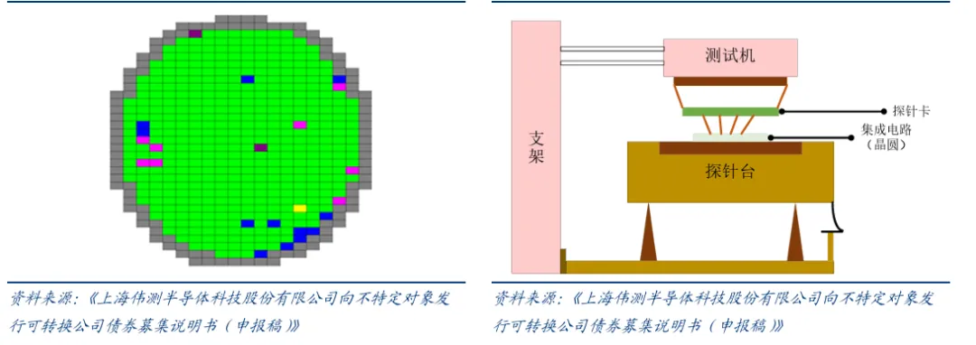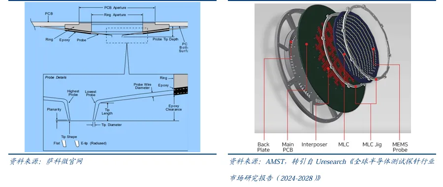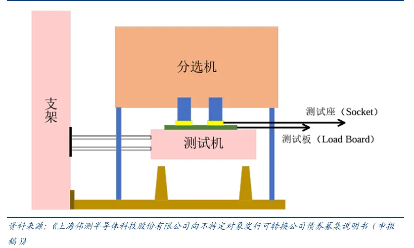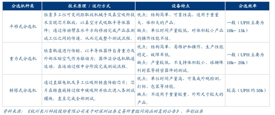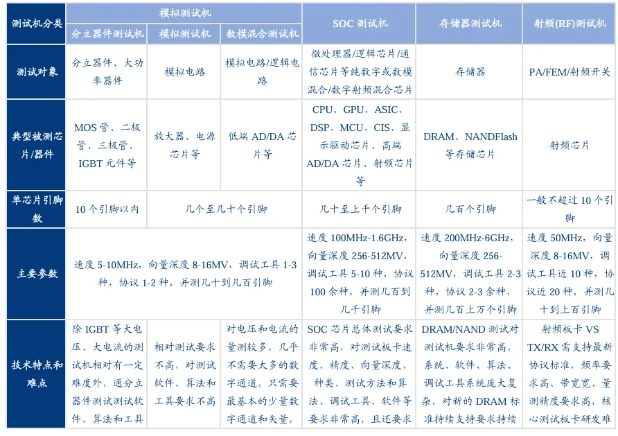 摘要:由于半导体行业体系庞大,理论知识繁杂,我们将通过多个期次和专题进行全面整理讲解。本专题主要从半导体测试设备深度报告进行讲解,让大家更准确和全面的认识半导体地整个行业体系。我们分为半导体知识、半导体“芯”闻几个模块,欢迎各位大佬交流学习。半导体测试设备是集成电路产业链核心装备,涵盖晶圆测试、封装测试及功能验证等环 节。半导体测试设备贯穿于集成电路制造的全生命周期, 且因半导体生产流程极其复杂, 为了防止坏品流入下一道高成本工序,测试必须分段进行,主要在晶圆制造后的CP测试 与封装后的FT测试两大核心环节发挥决定性作用:CP测试(Circuit Probing/Wafer Sort): 发生在晶圆制造完成之后、封装之前。测试 机配合探针台,通过探针卡与晶圆上的裸芯接触施加输入信号并采集输出信号,测试 其功能和电性参数。测试结果通过通信接口传送给探针台,探针台据此对芯片进行打 点标记,形成晶圆的 Mapping,即晶圆的电性测试结果。核心目的是“挑出坏 Die”, 避免将不合格的芯片封装进昂贵的管壳中,从而节省封装成本。FT测试(Final Test): 发生在封装完成之后、出货之前。测试机配合分选机,对封 装好的芯片进行全功能测试(包括逻辑功能、性能指标、环境适应性等)和电参数测 试。分选机将芯片自动送入测试工位,并通过基座与连接线将芯片引脚接入测试机; 测试机施加测试信号并采集输出结果,判断芯片功能与性能是否达标,测试结果回传至分选机,由其完成芯片的分选、标记及收料或编带。FT核心目的是“把好最后一关”, 确保交付给下游终端厂商的产品是100%合格的成品。 测试机(ATE): 作为测试系统的“大脑”,负责运行测试程序并处理数据,价值量 占比最高。2024年约占中国测试设备市场总规模的62.3%。 探针台(Prober): 作为CP环节的“机械手臂”,将晶圆逐片自动传送至测试位置, 芯片的管脚通过探针、专用连接线与测试机的功能模块进行连接的设备。2024年约 占中国测试设备市场总规模的20%。 分选机(Handler): 作为 FT 环节的“自动化搬运工”,是根据集成电路不同的性 质,对其进行分级筛选的设备。2024年约占中国测试设备市场总规模的17.7%。 其他(如探针卡、Socket等): 耗材及辅助设备。1、测试机多细分赛道结构性分化,SoC与存储共筑高价值量技术深水区 依据被测芯片的功能差异,测试机市场划分为模拟、SoC、存储及射频四大核心赛道,各 赛道在参数性能、价格区间及国产化程度上存在显著的结构性差异。 参考观研天下整理 数据,这四类设备构成了清晰的金字塔结构,由低速高精度向高速高并行逐级抬升:模拟及混合信号测试机(Analog/Mixed Signal):技术相对成熟,国产化率较高,竞 争焦点在于高精度而非高速度。 这类设备主要针对电源管理(PMIC)、放大器及分 立器件(MOSFET/IGBT)。其单芯片引脚数通常在10个以内,测试速度仅需5-10MHz, 向量深度较浅。 射频(RF)测试机:核心壁垒在于射频板卡的频率覆盖、带宽与测量精度,主要应 用于PA及射频开关测试。虽然引脚数同样较少,但需支持5G/6G等最新通信标准, 对频率与带宽精度要求极高,单价约30–40万美元,技术难度显著高于模拟类设备。 SoC测试机:市场份额最大且壁垒极高,面向CPU、GPU、MCU及手机AP等复杂 数字芯片。其核心挑战在于大规模数字通道与多协议协同处理,引脚数可达数千个, 测试速度覆盖100MHz至1.6GHz以上,向量深度可达256MV以上,并需支持MIPI、 PCIe、DDR等上百种通信协议。设备单价跨度约20万–150万美元,目前国产化率 较低,是国产厂商攻坚的主战场。 存储测试机:主要用于DRAM与NAND Flash测试,技术核心在于极致并行测试能 力。为降低单位测试成本,单机需同时测试1024个甚至更多DUT,测试频率可达 200MHz–6GHz以上,对系统调度与热管理能力提出极端要求,单价约100万–300 万美元,是测试机中价值量最高、也是国产化率最低的“深水区”之一。从市场结构看,SoC测试机已成为当前测试机市场中占比最高的细分品类。2、探针系统筑牢晶圆测试精密基石,MEMS探针卡随先进制程加速渗透探针台系统由精密机械、光学观察、探针定位、环境控制与信号接口等子系统协同构成。 其中精密机械平台包含载物台、探针座与减震系统,载物台负责样品高精度移动定位, 高端设备定位精度可达≤1μm,减震系统用于隔离外部振动;显微观察系统配备长工作距 离物镜,放大倍数一般覆盖50×–500×并支持明场/暗场观察,以便监控探针与焊盘接触; 探针定位系统由探针臂、探针座及manipulator构成,支持多探针同时接触,兼容钨针(直 径≤25μm)、铍铜针及射频探针(频率≤67GHz)等;高端机型可集成温控(-40℃~300℃ 或更宽)、磁控(≤1T)与真空等环境模块;信号连接端提供BNC、SMA、Triax等接口, 并通过低噪声屏蔽设计将噪声控制在≤1nV,以满足高精度测试需求。探针卡(Probe Card)作为连接ATE测试机台和半导体晶圆之间的接口,结构类似于一 块定制的PCB。它由探针(probe)和其他功能部件组成。探针是探针卡的核心部件,负 责实际与晶圆接触,PCB则作为载体,承载探针和其他元件,并实现信号传递。根据结 构和技术可以分为以下几种类型: 悬臂式探针卡:探针呈悬臂伸出、成本较低,通常用于焊垫或凸块较大的传统模拟/ 部分逻辑芯片,但探针相对较粗、针痕较深,重复接触下更易造成焊垫损伤; 垂直式探针卡:探针垂