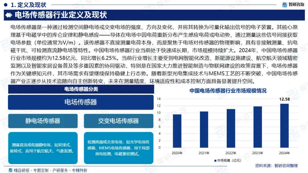 电场传感器是一种通过检测空间静电场或交变电场的强度、方向及变化,并将其转换为可量化输出信号的电子装置。中国电场传感器行业正处于快速成长期,2024年市场规模达12.58亿元,同比增长6.25%,驱动因素涵盖电网智能化、新能源设施建设、航空航天精密监测及智能家居普及等。技术层面,MEMS与光电集成技术突破推动产业从“技术追随”向“自主创新”转型,未来在测量精度、环境适应性及成本控制方面潜力显著。