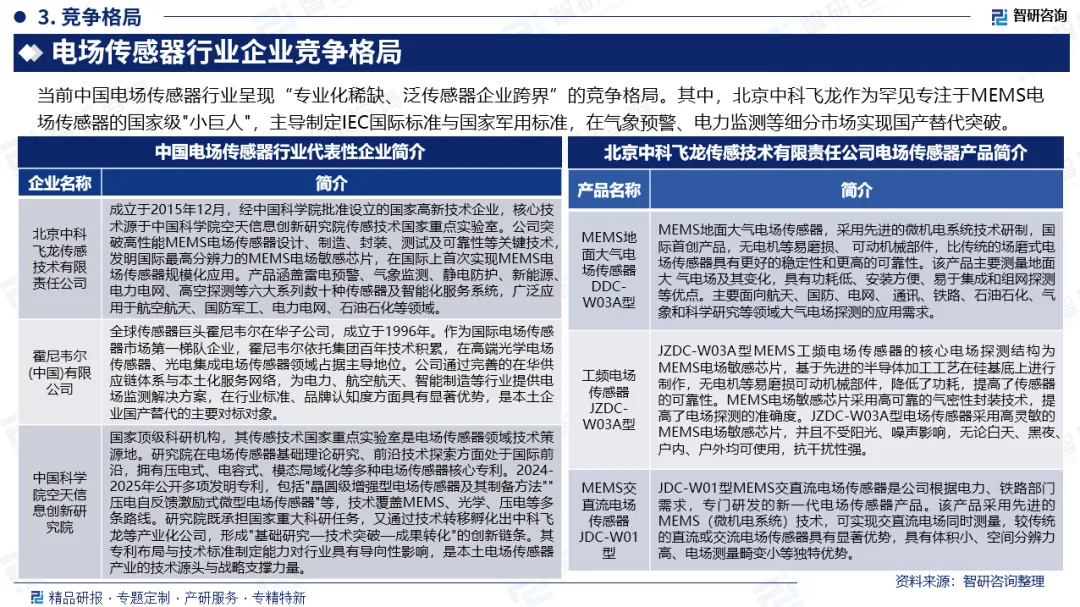 竞争情况:当前中国电场传感器行业呈现“专业化稀缺、泛传感器企业跨界”的竞争格局。其中,北京中科飞龙作为罕见专注于MEMS电场传感器的国家级"小巨人",主导制定IEC国际标准与国家军用标准,在气象预警、电力监测等细分市场实现国产替代突破。