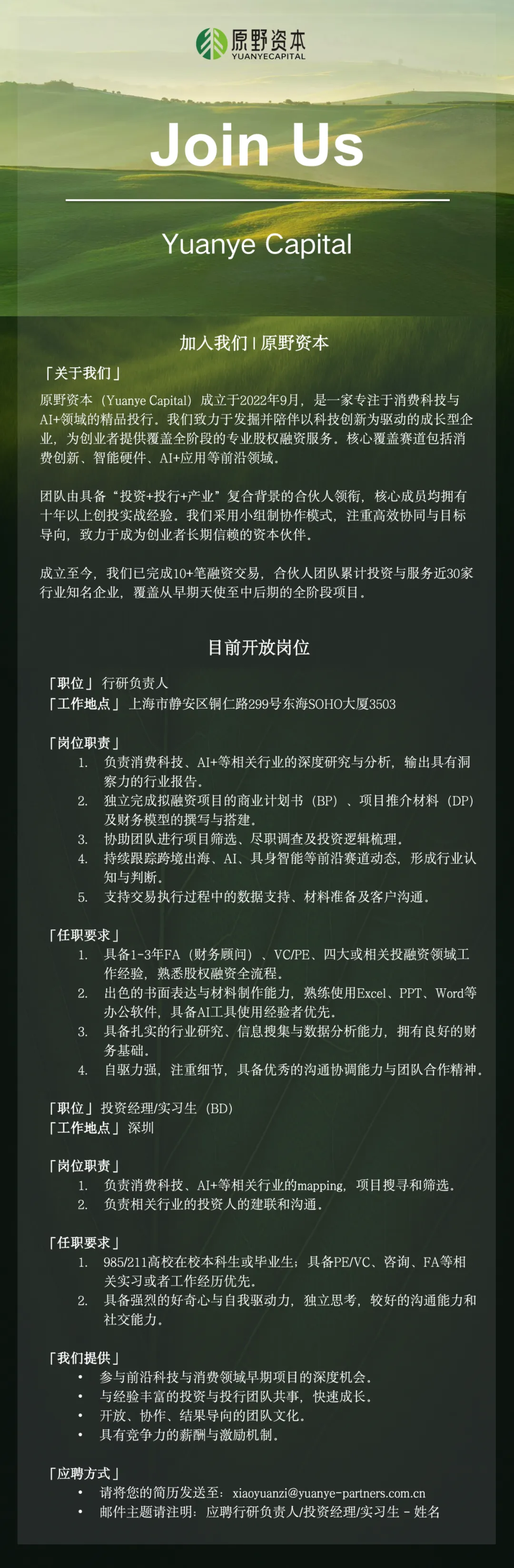 【社招&实习】原野资本招聘行研负责人/投资经理/实习生