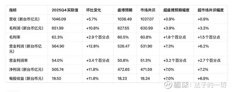 1. 业绩超预期核心 : 2025Q4 营收 1 046.09 亿新台币(同比 + 5.7%), 净利润 5 05.74 亿新台币(同比 + 11.8%), 毛利率 6 2.3%( 环比 + 2.9 个百分点),均超市场预期,成本控制、汇率利好与产能利用率提升是关键;