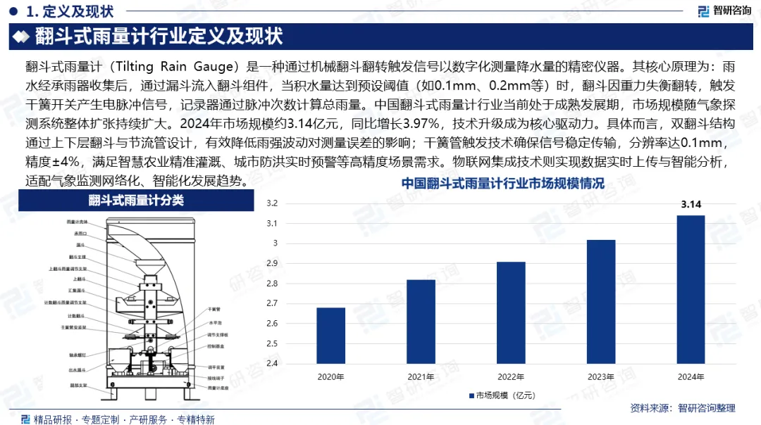 市场规模:中国翻斗式雨量计行业当前处于成熟发展期,市场规模随气象探测系统整体扩张持续扩大。2024年市场规模约3.14亿元,同比增长3.97%,技术升级成为核心驱动力。具体而言,双翻斗结构通过上下层翻斗与节流管设计,有效降低雨强波动对测量误差的影响;干簧管触发技术确保信号稳定传输,分辨率达0.1mm,精度±4%,满足智慧农业精准灌溉、城市防洪实时预警等高精度场景需求。物联网集成技术则实现数据实时上传与智能分析,适配气象监测网络化、智能化发展趋势。