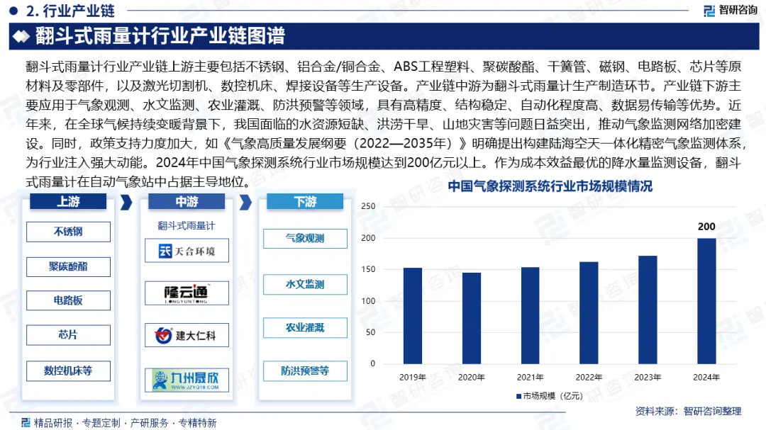 产业链核心节点:近年来,在全球气候持续变暖背景下,我国面临的水资源短缺、洪涝干旱、山地灾害等问题日益突出,推动气象监测网络加密建设。同时,政策支持力度加大,如《气象高质量发展纲要(2022—2035年)》明确提出构建陆海空天一体化精密气象监测体系,为行业注入强大动能。2024年中国气象探测系统行业市场规模达到200亿元以上。作为成本效益最优的降水量监测设备,翻斗式雨量计在自动气象站中占据主导地位。