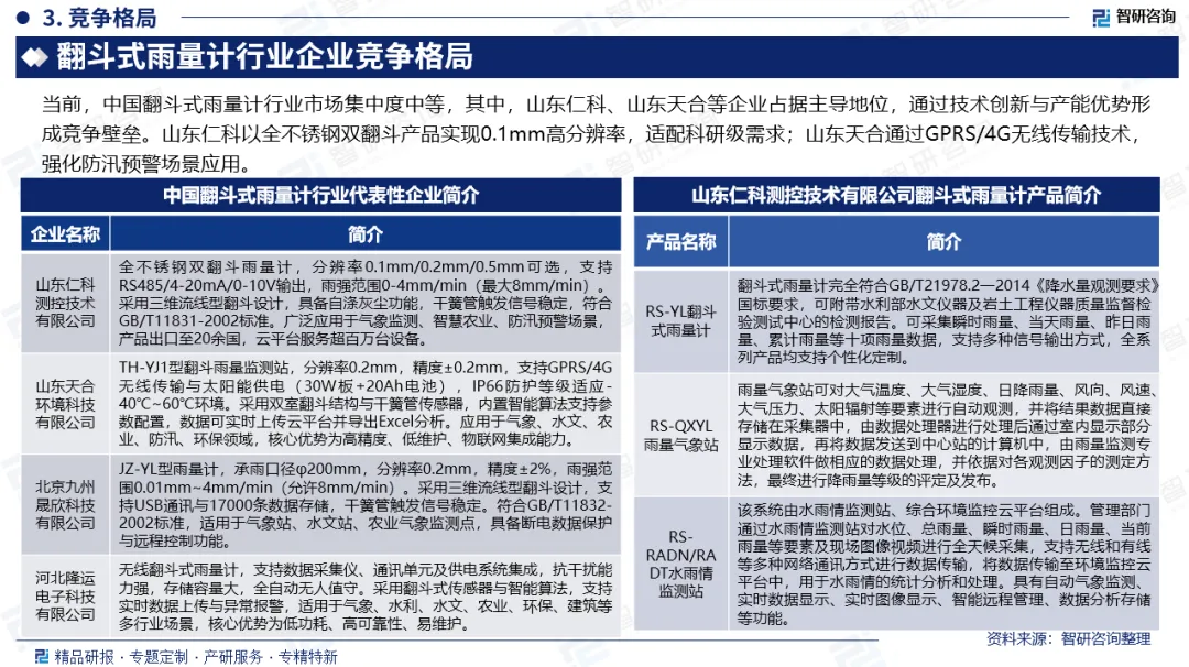 竞争情况:当前,中国翻斗式雨量计行业市场集中度中等,其中,山东仁科、山东天合等企业占据主导地位,通过技术创新与产能优势形成竞争壁垒。山东仁科以全不锈钢双翻斗产品实现0.1mm高分辨率,适配科研级需求;山东天合通过GPRS/4G无线传输技术,强化防汛预警场景应用。