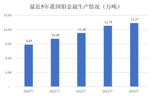 根据国际钼协会(IMOA)数据,2020年-2024年我国钼消费持续增长,年均复合增长率6.78%,2024年我国钼消费达到13.83万吨。