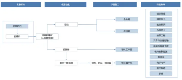 钼产业链下游是钼产品的深加工环节,主要产品包括钼金属和钼化工产品。