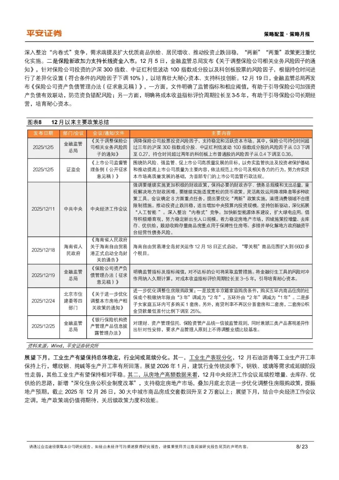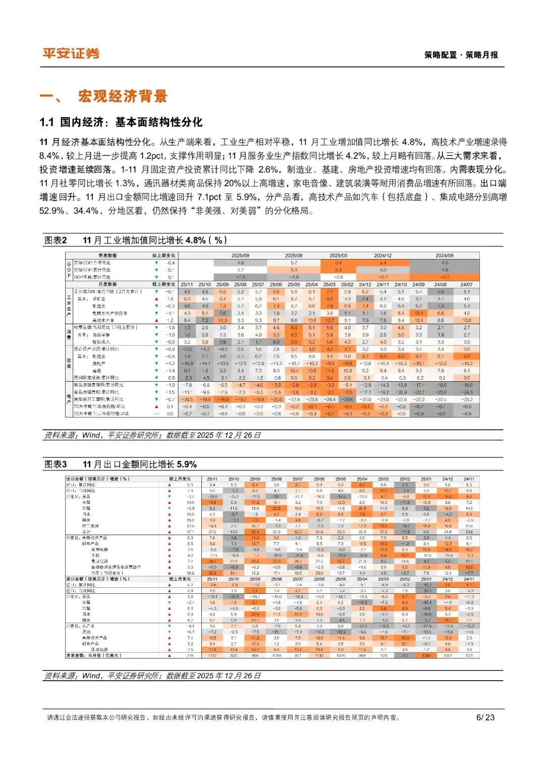2025 年 12 月境内资产在国内中央经济工作会议政策定调明晰、外部降息背景下,A 股有所反弹,债市窄幅震荡,人民币升值。一方面,11 月经济数据结构性分化,工业生产相对平稳,投资、消费增速回落,出口增速回升;物价延续结构性改善,社融增速持平上月,实体信贷仍偏弱;但另一方面,内外部政策预期的积极变化,驱动市场整体风险偏好抬升:一是中央经济工作会议定调偏积极的政策取向;二是保险新政加力支持长线资金入市;三是海外美联储 12 月如期降息,并释放偏鸽信号。在此背景下,A 股震荡反弹,且风格再度回摆至高景气成长;债市窄幅震荡,收益率曲线陡峭化;人民币汇率保持升值态势。