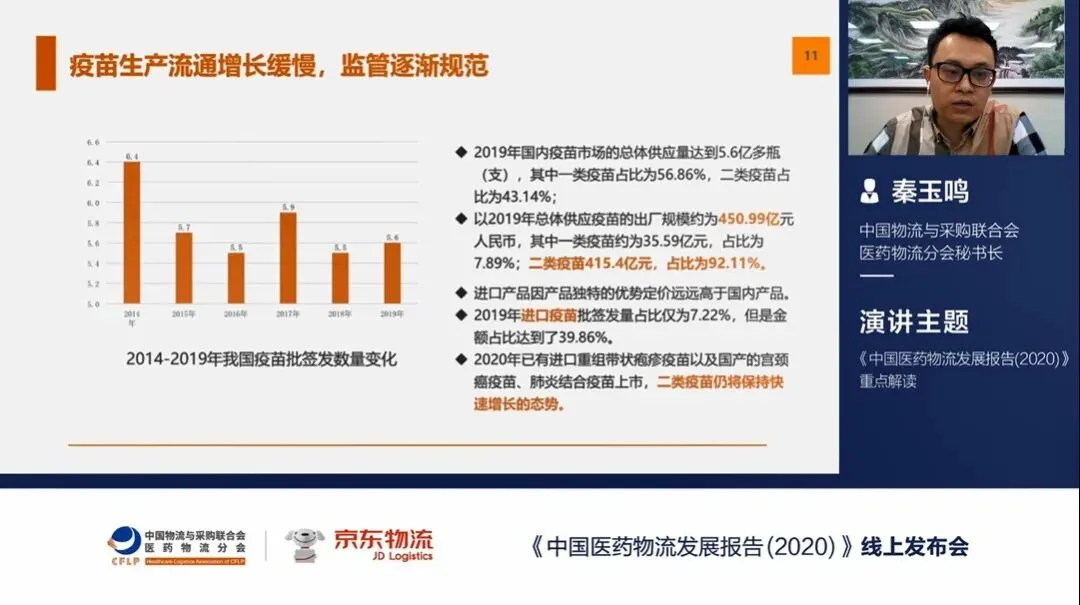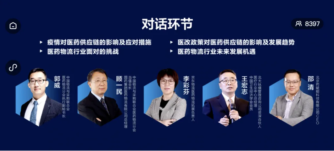 首先崔忠付以《直视疫情,鉴往思变》为主题进行致辞,崔忠付表示在政策和市场的双重驱动下,2019年我国医药流通行业发展态势良好,但是机遇与挑战并存。面对疫情大考,我们要鉴往思变,把握未来的发展趋势,在聚焦供应链能力提升的同时,更加重视供应链应急体系的建设。在疫情防控常态化背景下,要把协同化作为行业发展的重要准则,技术作为行业发展的重要推动力,把握住数字化发展的主流趋势与“互联网+医药”带来的发展新机遇。随后秦玉鸣从2019年中国医药供应链发展现状、行业热点,深度剖析、我国医药物流行业运行现状、我国医药供应链发展趋势四方面对发展报告进行解读。秦玉鸣对参会嘉宾表示欢迎,对京东物流的大力支持表示感谢。他在解读中提到随着“三医联动”的不断推进,迅速改变了目前医疗与医药市场的格局,行业的集中度不断提高,医药供应链进入“微利时代”。与此同时,无论是医药生产企业、医药商业企业、医药物流企业还是设备企业,在政策和市场的双重驱动下,孕育了一些新的商业模式,促使行业不断转型升级。2019年我国医药物流总费用为677.71亿元,较2018年增长10.39%。医药仓储规模及自有车辆稳步增长等良好发展态势。但是医药供应链同时面临物流成本压力、缺少完备的供应链风险管理体系、缺少足够的供应链弹性、专业人才缺乏等挑战。在政策和市场的双重驱动下,医药供应链将呈智慧化、数字化、协同化、自动化、快速响应,供应链柔性等趋势。对话环节中,中国物流与采购联合会医药物流分会当值会长、国药集团医药物流有限公司总经理顾一民,京东物流医药物流拓展负责人李彩芬,北大纵横管理咨询公司资深合伙人、医疗行业中心总经理、中国卫生经济学会会员王宏志,北京药赋能科技有限公司CEO邵清围绕“新冠疫情对医药供应链的影响、公共卫生体系建设、集中带量采购、医保支付等政策对供应链的影响,以及互联网医疗背景下,医药电商的发展趋势”等话题展开分享讨论。◑ 疫情对医药供应链从生产、分销、配送模式受到了很大的影响,进一步印证了完善的供应链体系至关重要。