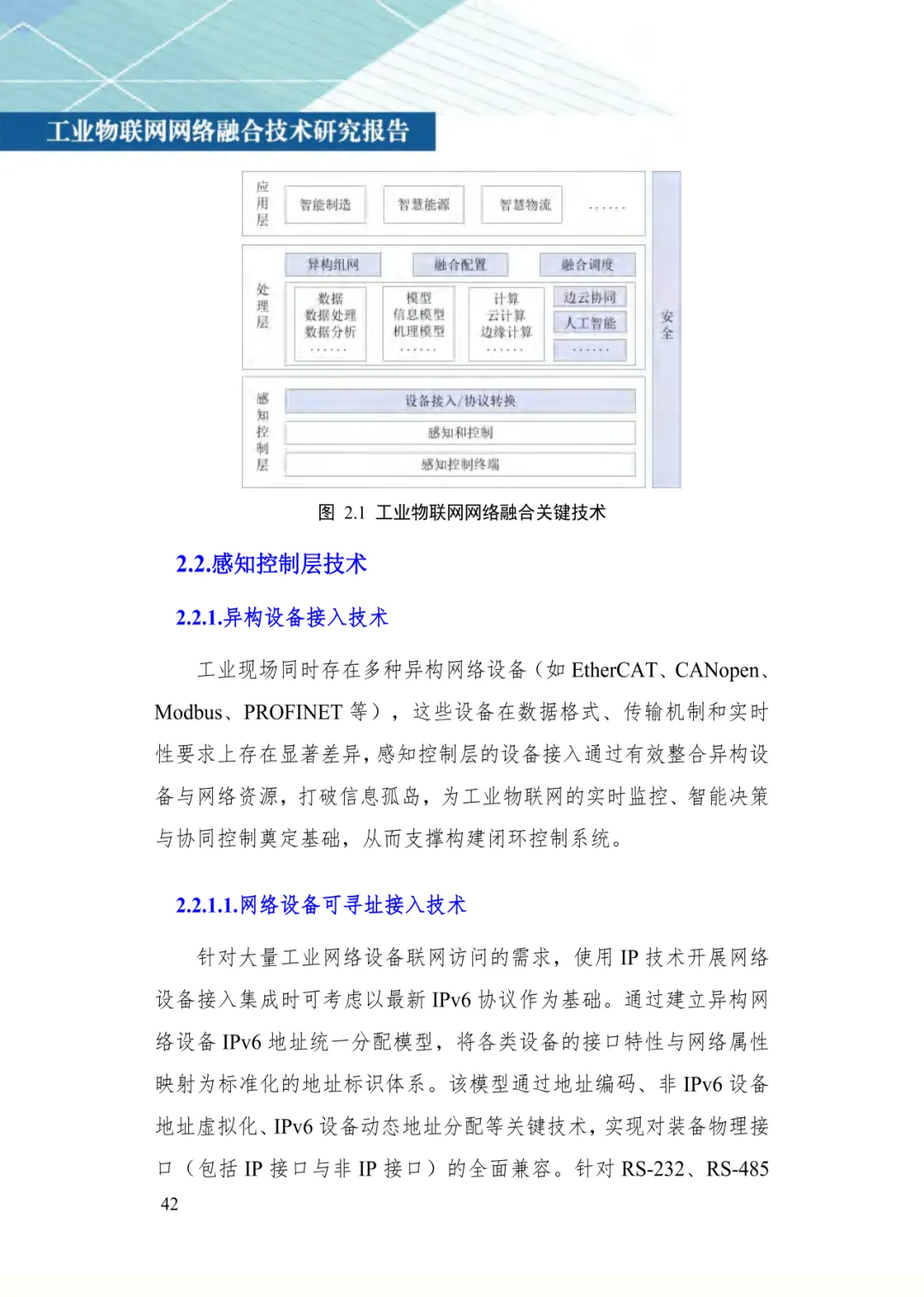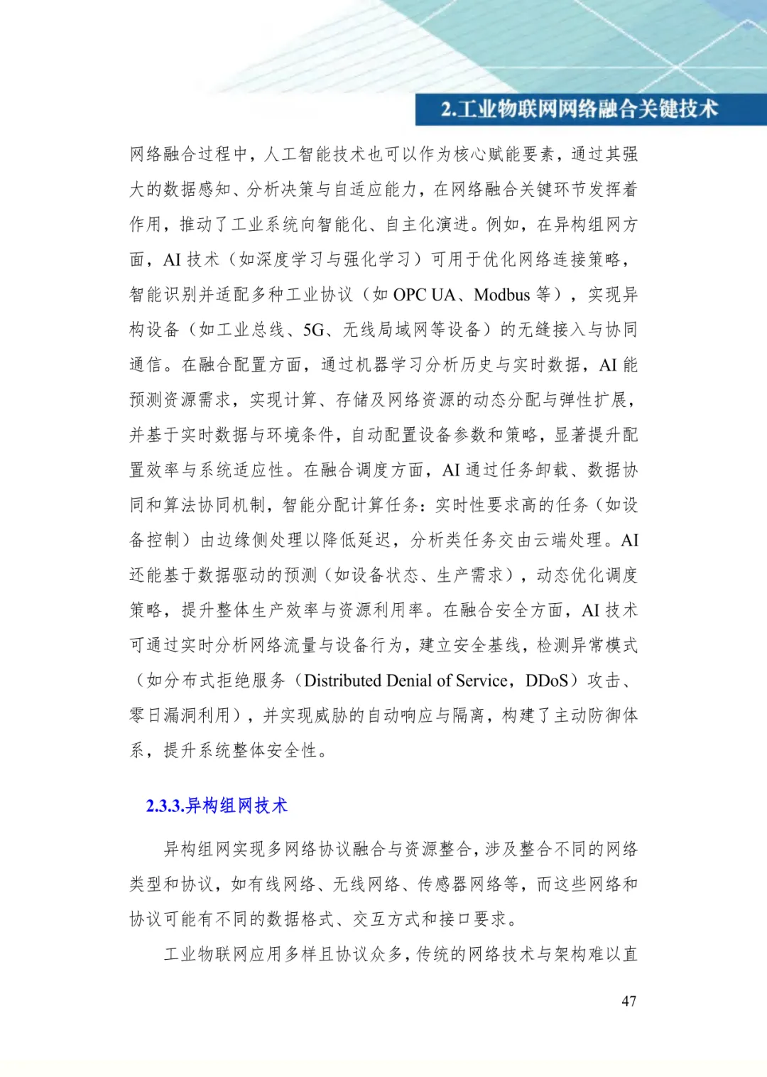 技术层面,报告构建“感知控制层-处理层-应用层”技术体系:感知控制层聚焦异构设备接入(IPv6可寻址、语义识别互认)与协议转换(通用+专用转换集、IP为核心适配);处理层涵盖边云协同(屏蔽底层差异、资源动态分配、任务卸载闭环)、人工智能(优化组网/配置/调度/安全)、异构组网(装备信息建模、资产管理壳AAS、通用语义模型互通)、融合配置(体系建模、SDN技术、全局信息管控、5G-TSN交互)、融合调度(高精度跨网时间同步、现场级异构网络确定性调度、端边云协同);网络融合安全技术贯穿设备层(硬件可信根、安全启动、PUF)、协议级(加密隔离)、边界(零信任微隔离、下一代防火墙)、数据全生命周期(端到端加密、区块链存证、差分隐私)及统一安全管理(SOAR、供应链审计),形成纵深防御体系。