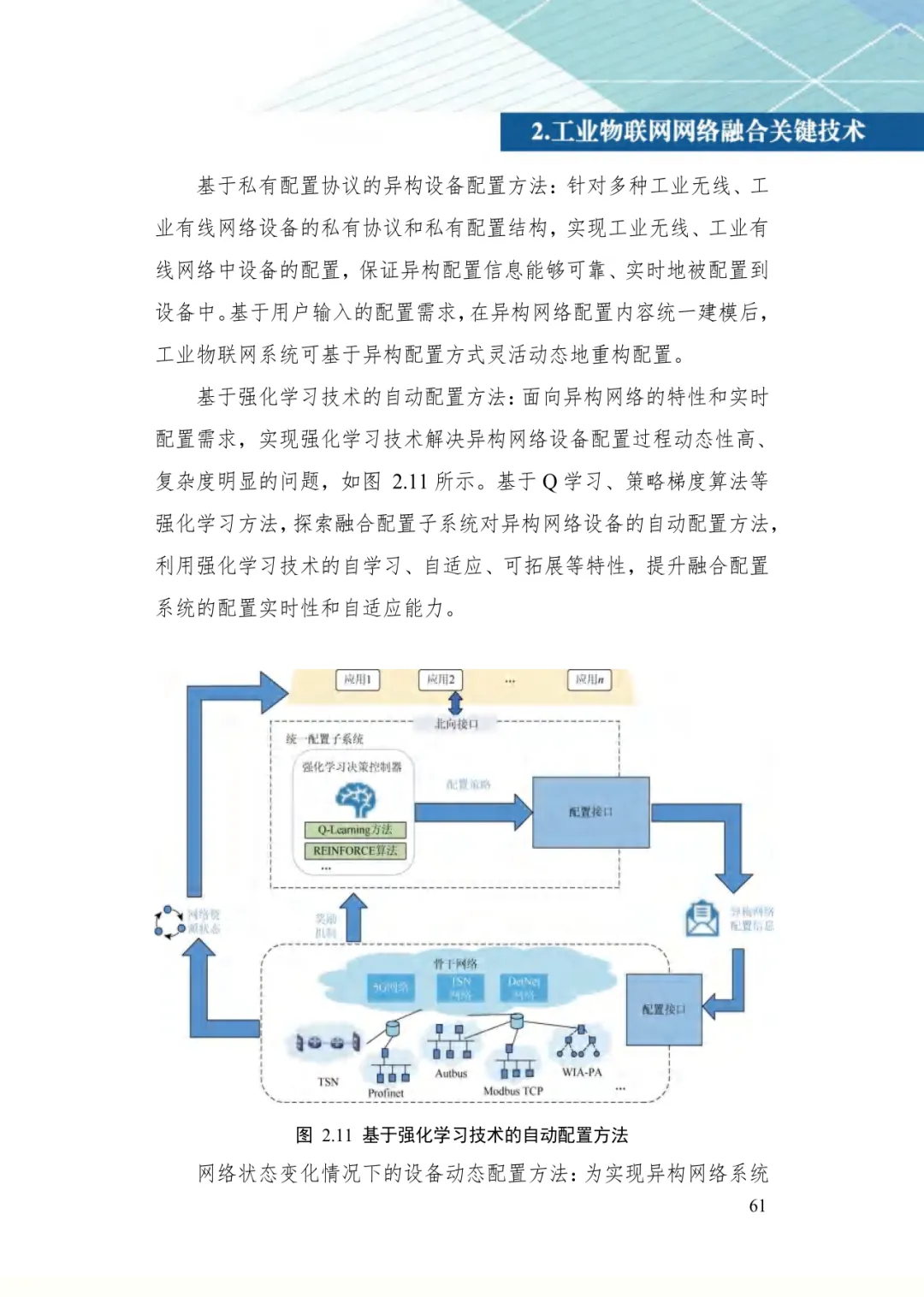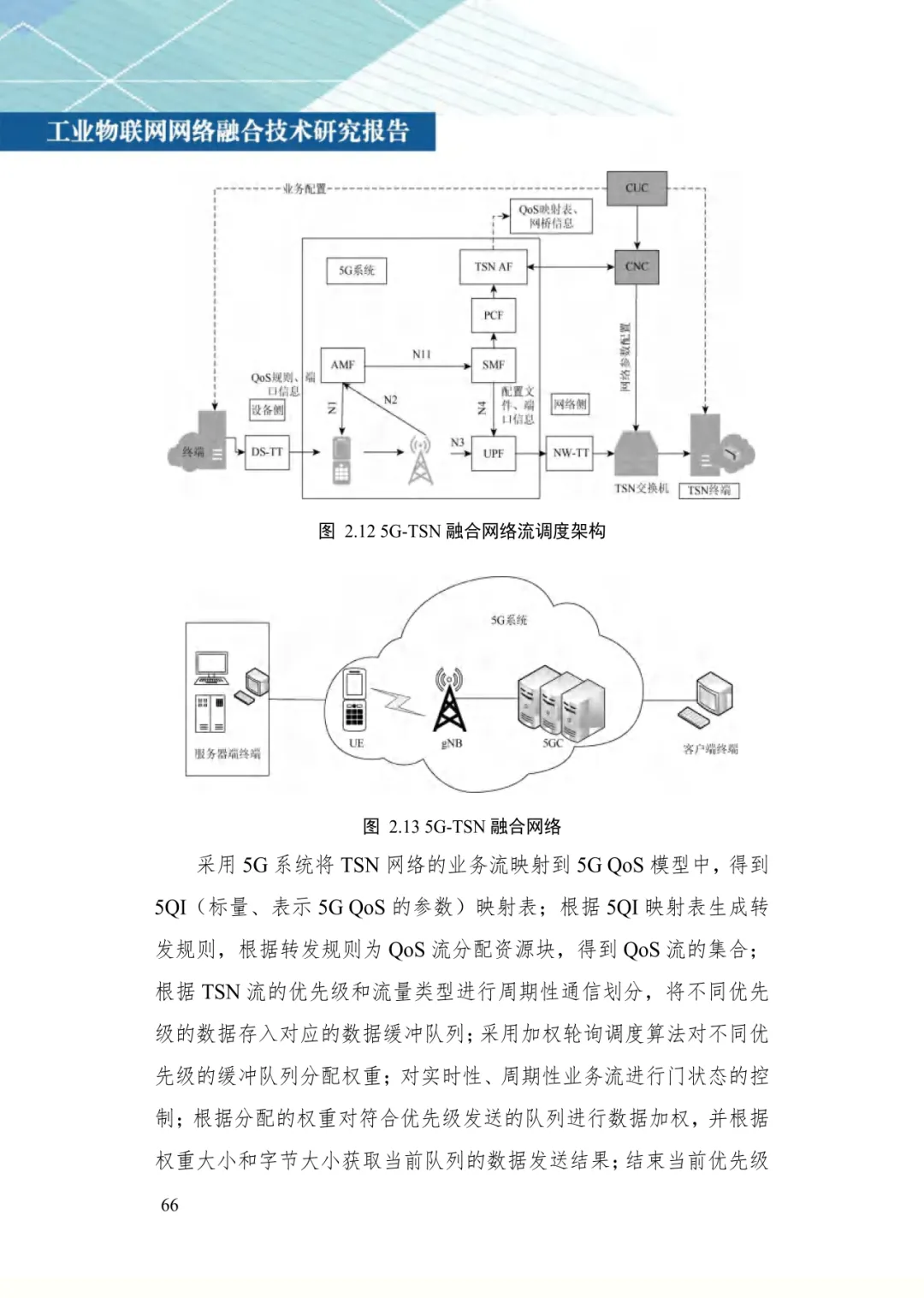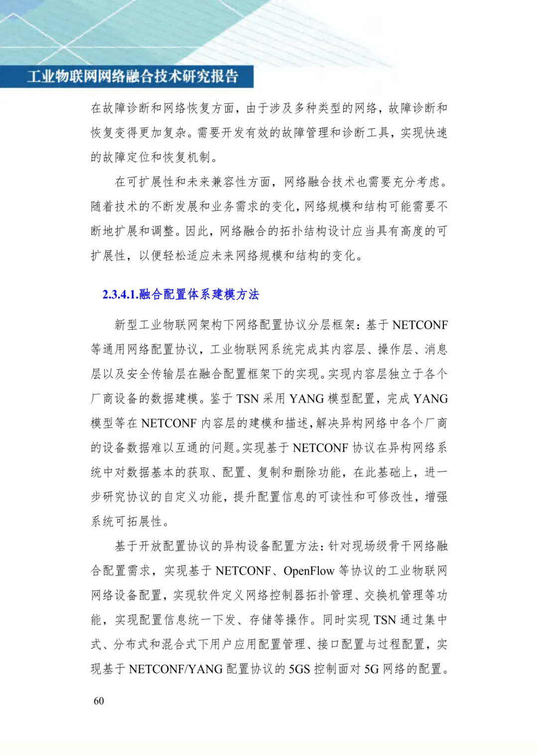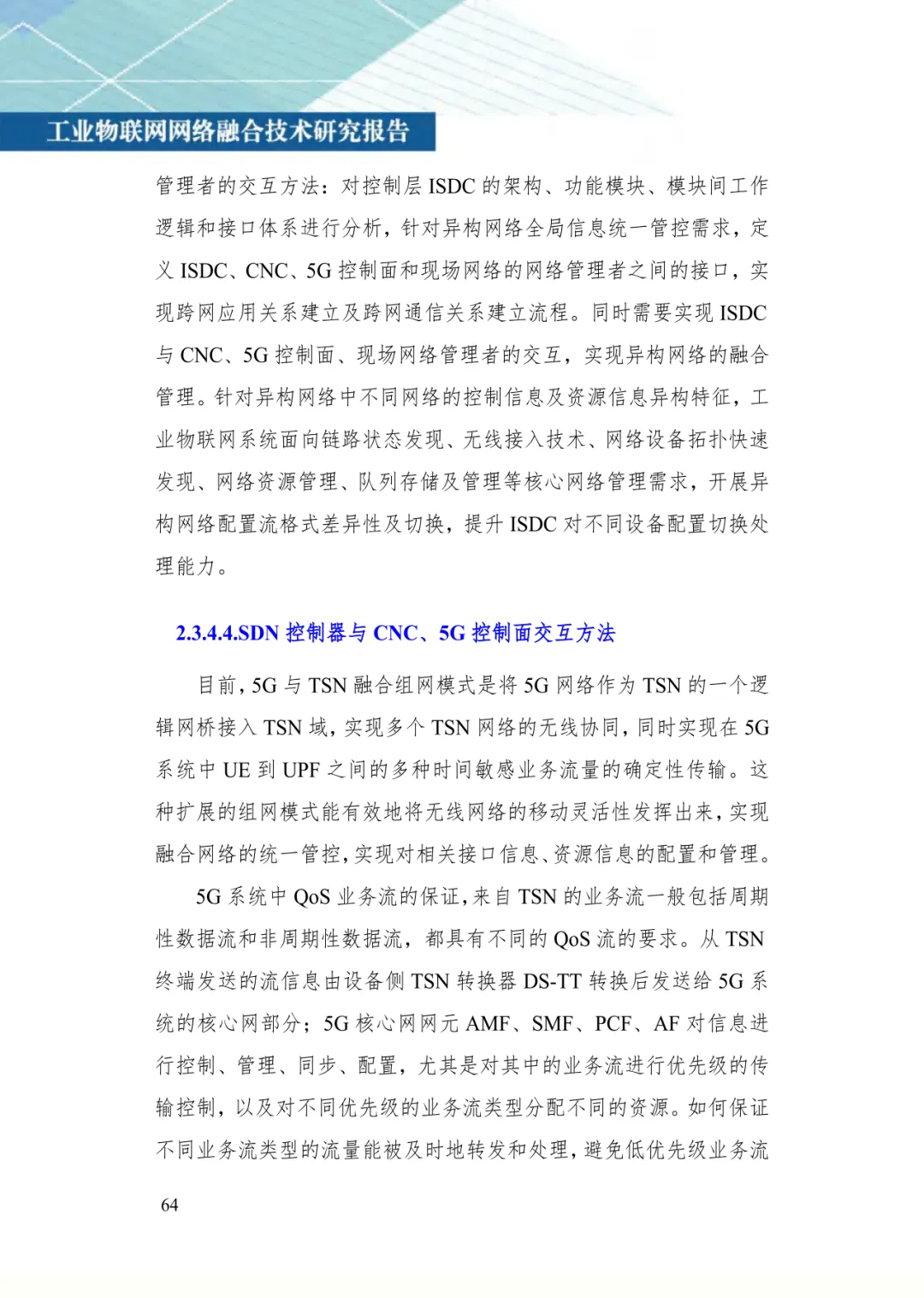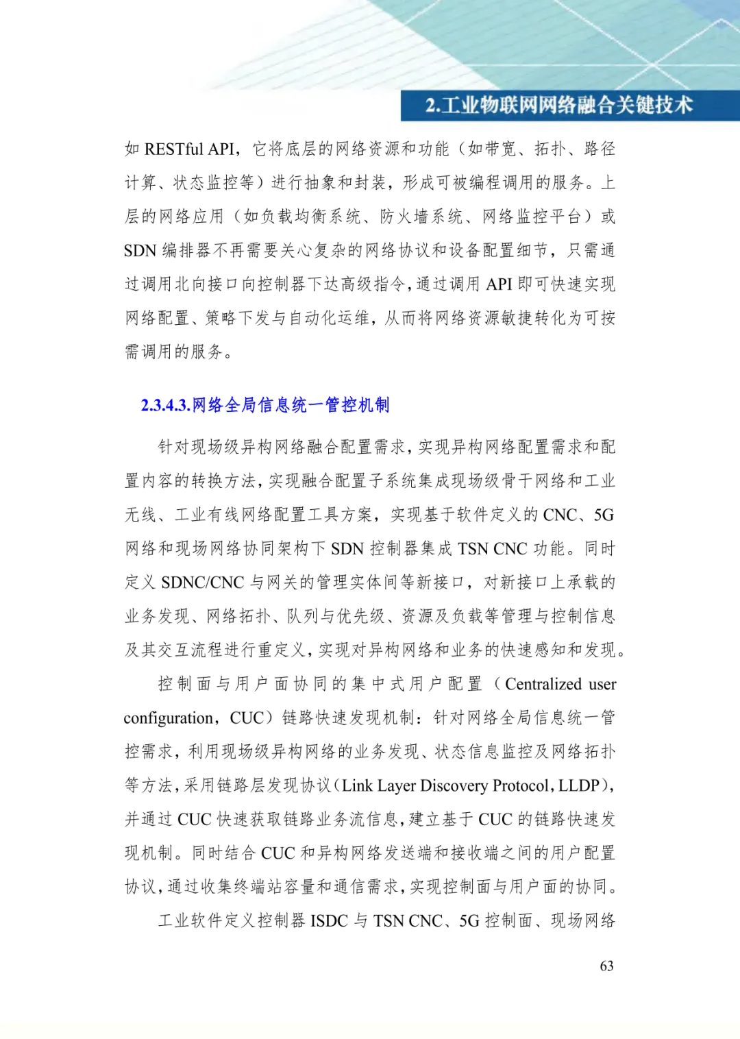 报告系统梳理产业需求与技术现状,提出“异构组网-融合配置-协同调度-过程管控”一体化架构,继承软件定义网络(SDN)控制与数据平面分离思想,分数据面、控制面、用户面三层:数据面整合边缘网络/边缘云、工业骨干网与工业云,实现协议转换与数据采集控制;控制面以工业软件定义控制器(ISDC)为核心,含过程管控、协同调度、融合配置子系统,保障网络资源分配、跨网配置与系统不确定业务下的稳定运行;用户面承接上层工业应用意图,通过协同层应用程序解析北向接口,实现用户需求向网络能力的转化。针对工业有线(现场总线、工业以太网、TSN、AUTBUS等)与无线(WirelessHART、WIA-PA、5G等)网络特性,报告分析主流技术特征,提出分层叠加融合、工业以太网与5G混合组网、TSN-5G确定性网络融合、边缘计算驱动协议转换、双模混合通信融合等典型实施模式,并明确传输时延、带宽、可靠性、安全性、标准化、可管理性等关键能力指标。