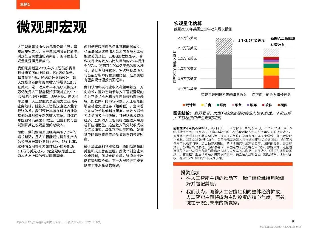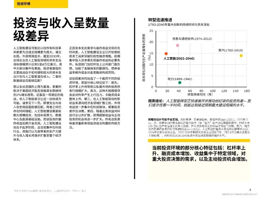 莱德的投研团队每年都会举行两次为期两天的会议,以讨论全球经济和市场的前景及其对投资组合的影响。我们上一届论坛讨论和辩论的压轴议题是《全球投资展望》,藉此我们深度掌握了宏观脉络。今年更明确的一点是,我们数年前推出的颠覆性趋势框架,已成为洞悉经济转型驱动力及由此催生的投资机会的关键工具。本期展望报告的核心在于调和人工智能建设过程中巨额投资与潜在收入的量级差异,并分析人工智能趋势如何与能源转型、未来的金融体系等其他颠覆性趋势相互交汇。