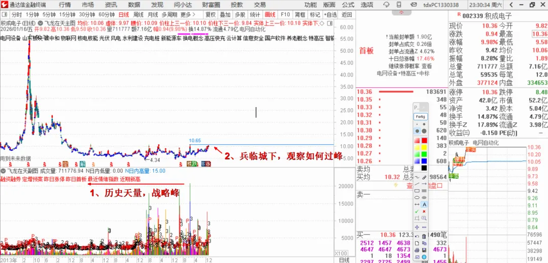 0114画线案例红相股份,周四低开回踩,周五反包,持续跟进0115画线案例蓝箭电子,高开回落,量能持续倍倍量,继续跟进风险提示:这个模块罗列的是当天画线学习的个股,他们仅作为一段时间内的强弱观察学习, 仅为复盘用。投资有风险。关于有朋友提到文章发了后,第一时间收不到,是因为没点“星标”,动一动小手指,点下“星标”,文章发出后马上能收到,如果还是收不到,那么取消星标,重新点一下就好。 (这个是系统推送机制的原因)