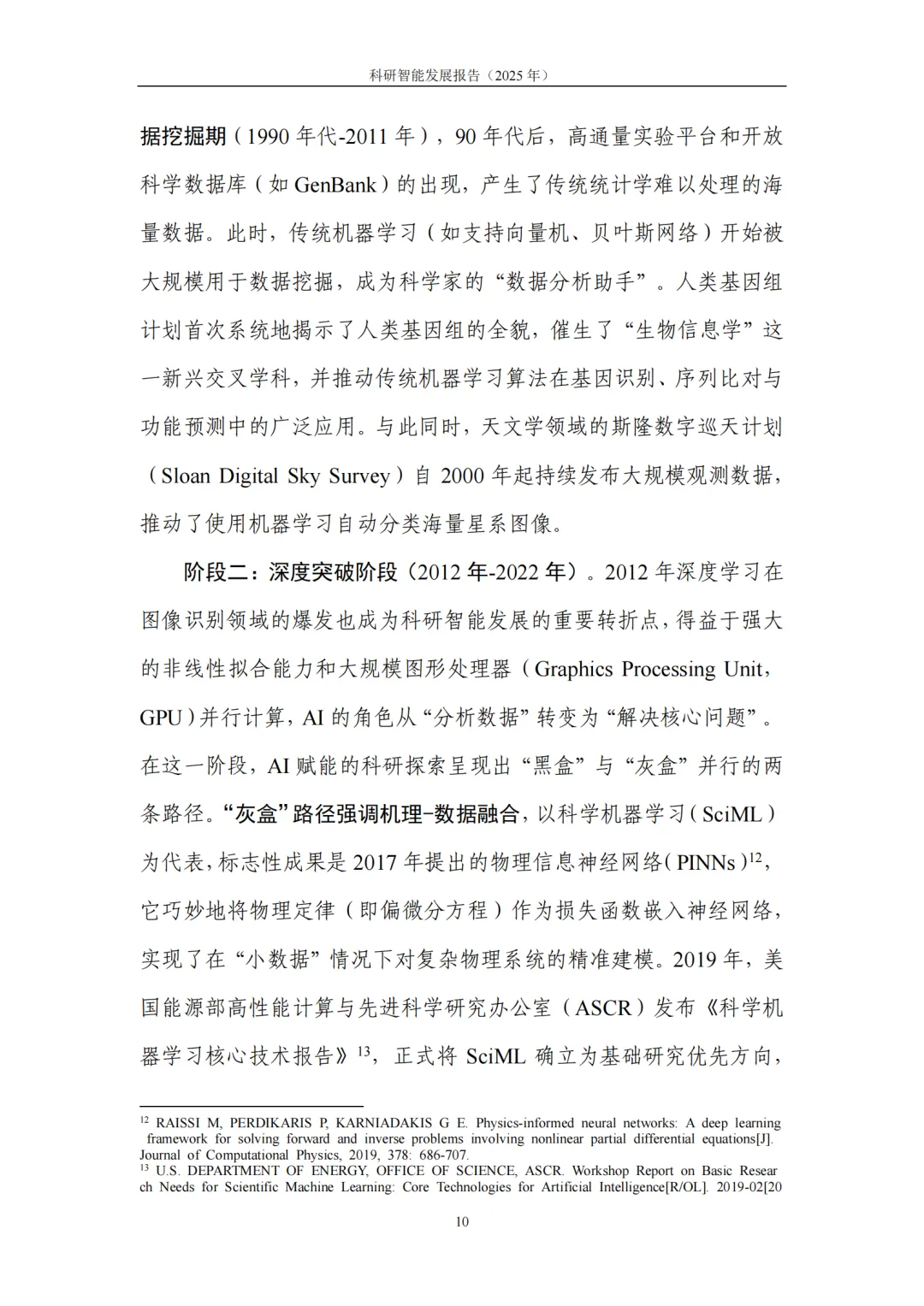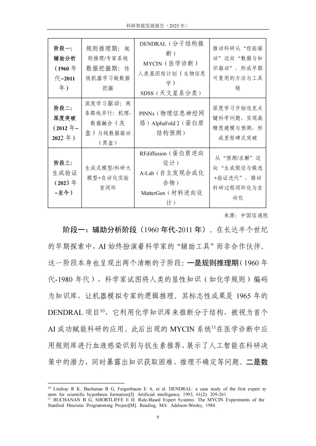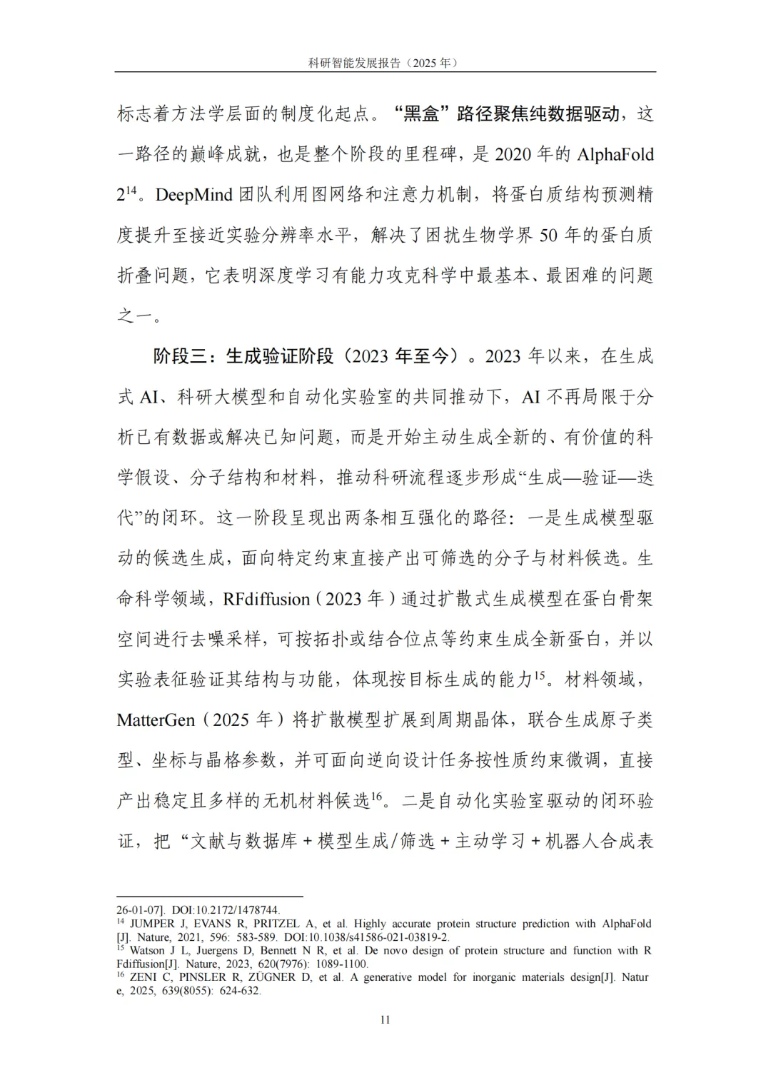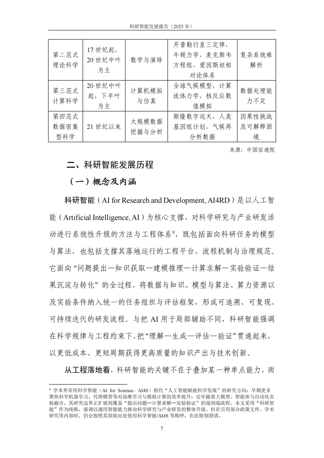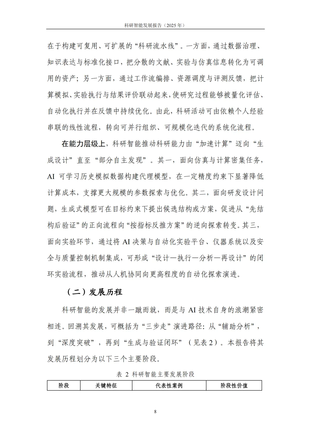 1. 内涵及发展:科研智能是“方法与工程体系”的系统升级。科研智能(AI4RD)是以人工智能为核心支撑,对科学研究与产业研发全流程进行系统性升级的方法与工程体系,涵盖面向科研任务的模型与算法,以及支撑落地运行的工程平台、流程机制与治理规范。从科研流程演进来看,科研智能呈现清晰的阶段性特征:从早期 “辅助分析” 阶段的规则推理与数据挖掘,到 “深度突破” 阶段深度学习驱动的关键科学问题攻坚,再到当前 “生成—验证” 闭环阶段,生成式模型与自动化实验平台的协同联动,正推动科研流程朝着系统化、自动化方向跨越式发展。