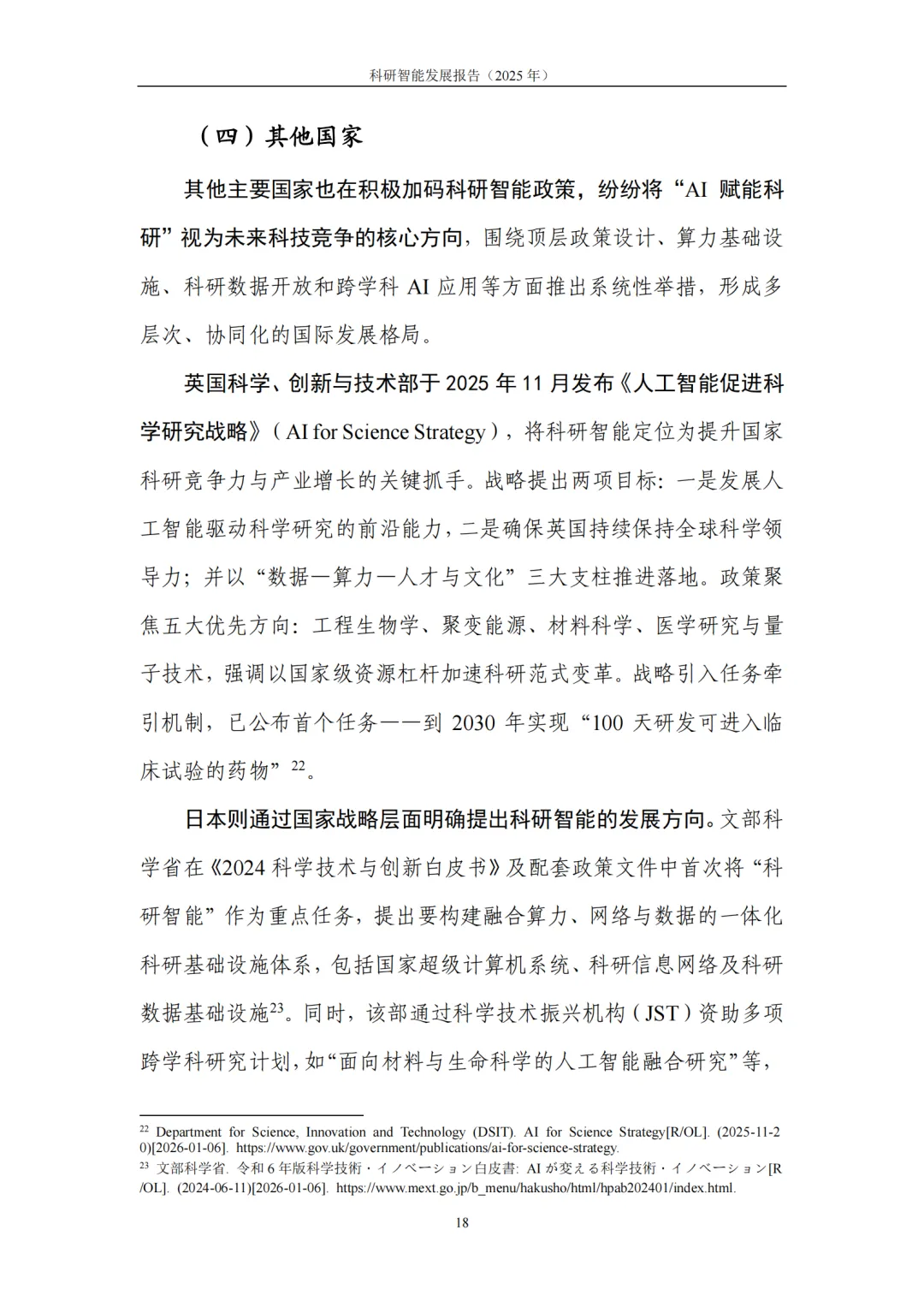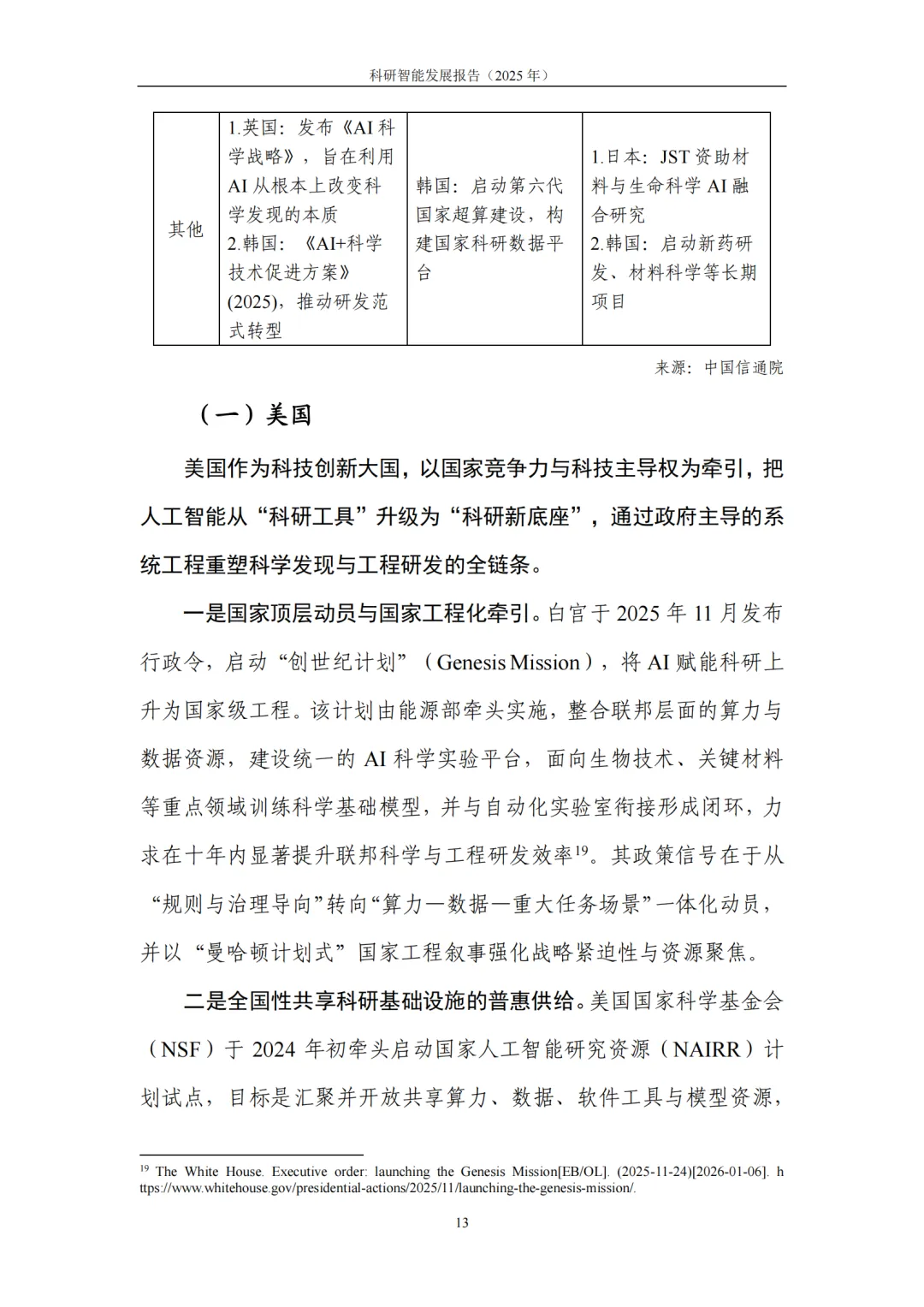 2. 政策分析:全球科研智能进入“国家级组织化竞争”阶段。各主要经济体正以 “顶层战略牵引—算力与数据底座—组织化投入—场景任务牵引” 的组合模式,加速布局科研智能赛道:美国通过 “创世纪计划” 整合国家算力与数据资源,构建 “曼哈顿计划式” 科研新底座;欧盟发布《科学人工智能战略》,依托欧洲开放科学云打造跨国界科研能力网络;中国以 “人工智能+” 行动为核心,将 “AI+科学技术” 列为首要任务,通过 “项目群+平台化” 组织机制,系统重构科研范式与创新链条;英国、韩国、日本等也纷纷通过专项方案、国家超算建设、科研数据平台搭建等举措持续加码,形成多层次、协同化的国际竞争格局。
