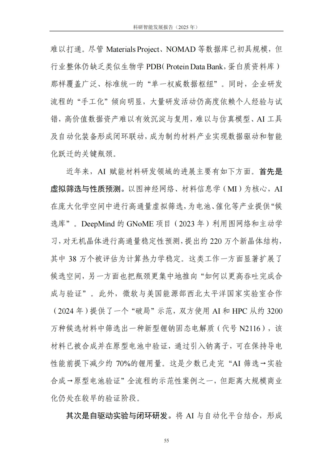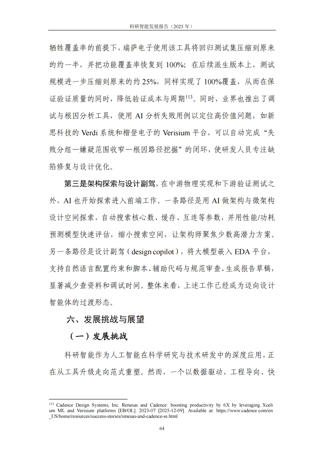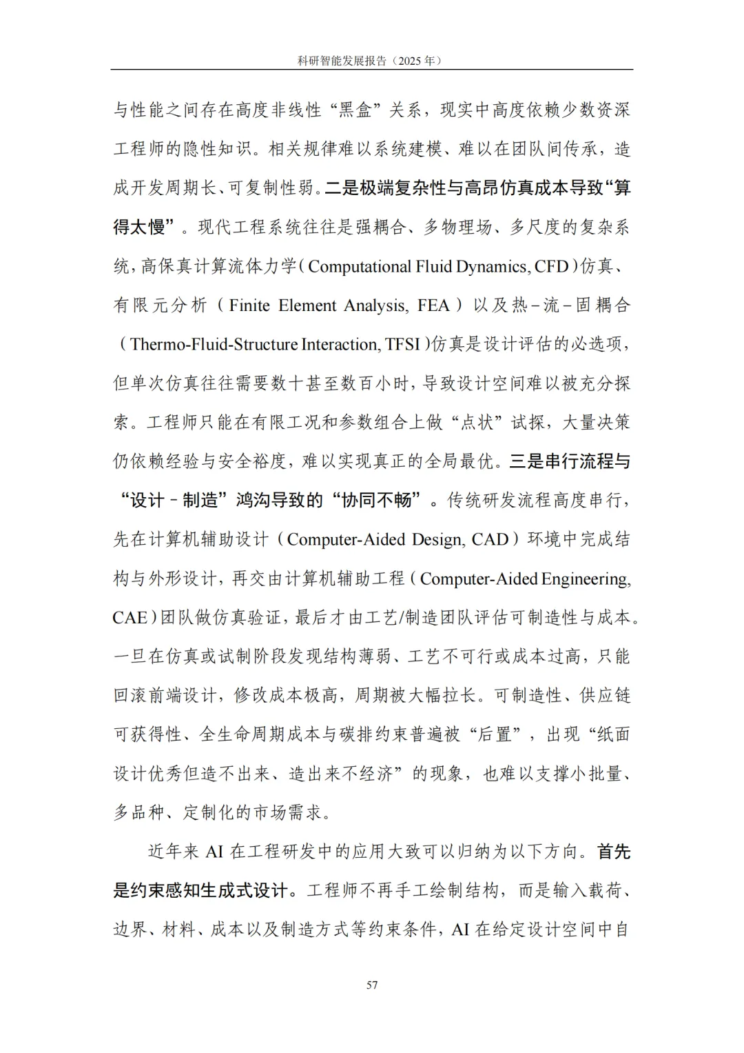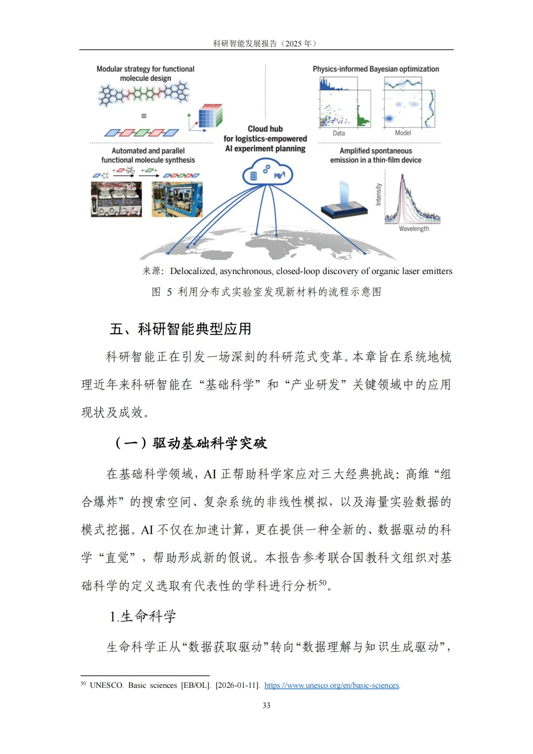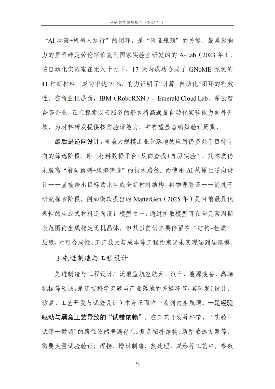 4. 典型应用:基础科学提效、产业研发提速,从“预测发现”迈向“目标驱动”的研发新范式。在基础科学领域,科研智能助力研究者高效应对高维搜索空间、复杂系统模拟与海量数据模式挖掘等挑战,显著提升假说提出与实验设计效率。在生命科学、化学、地球与空间科学、数学等领域,生成式模型与自动化平台深度结合,推动研究从 “预测” 迈向 “按目标约束生成候选—实验验证—迭代优化” 的闭环模式。在产业研发领域,科研智能与工程流程深度融合,将性能边界、制造约束、成本与碳排放等目标前置到设计与验证环节,大幅缩短迭代链路、提升全局优化可能性:医药研发中,AI加速靶点发现、分子生成与临床试验优化,直击行业 “投入产出比下降” 痛点;半导体领域,AI从验证覆盖优化、调试根因分析延伸至架构探索与设计副驾,帮助工程师快速筛选高潜力方案;先进制造与工程设计中,约束感知生成式设计让 “能造、好造、造得经济” 成为生成阶段的内生目标,显著提升研发实效。