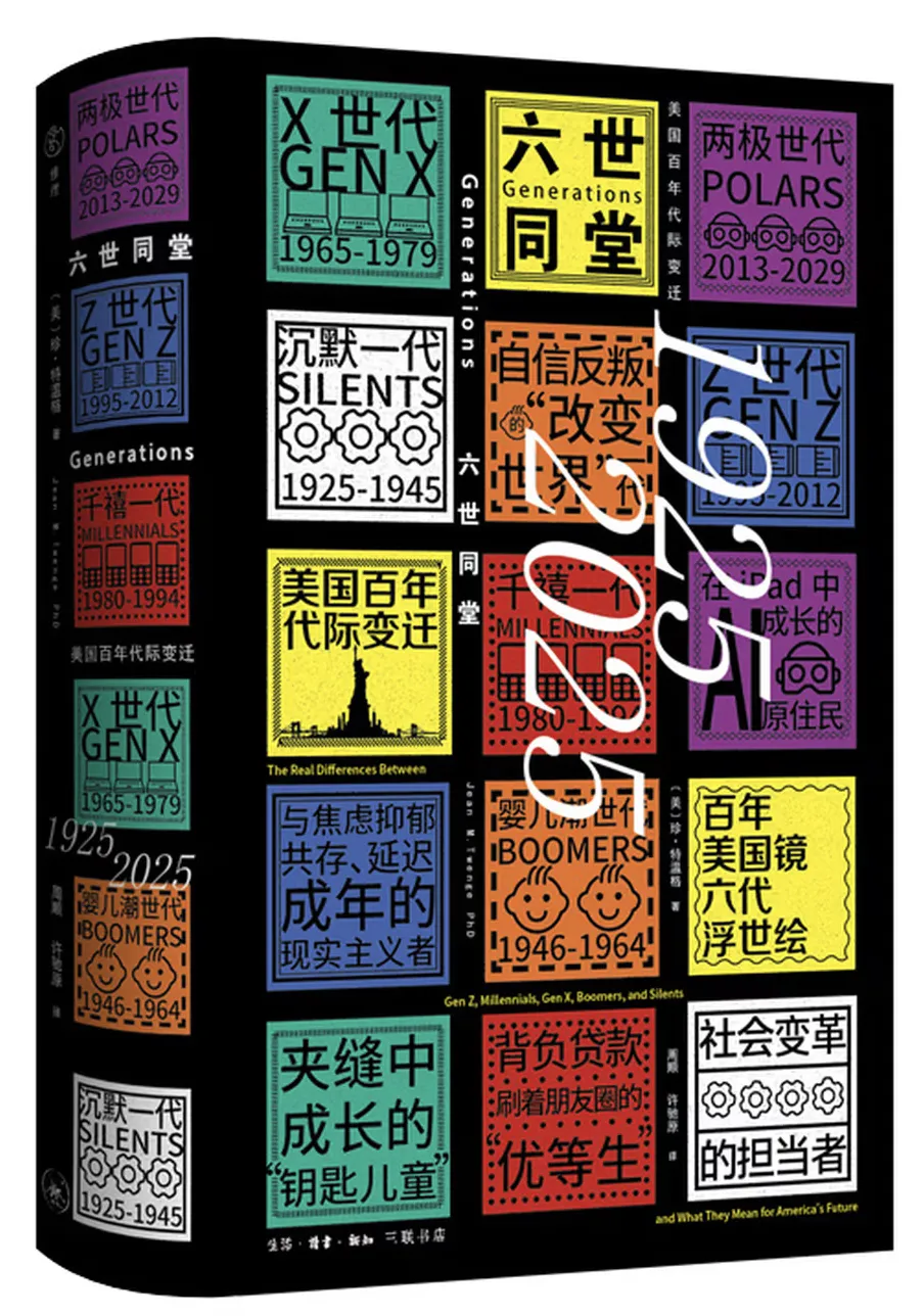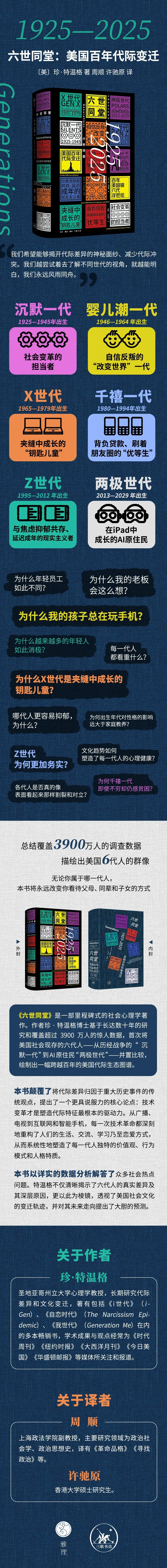 同一个办公室,70后老板、85后经理和00后新人,为什么仿佛来自不同的星球?我们真的理解自己的父母、子女或同事吗?今日为大家带来社会心理学家珍·特温格的里程碑著作《六世同堂:美国百年代际变迁,1925—2025》为我们提供了一副穿透时代迷雾的“精神图谱”。它基于覆盖超过3900万人的惊人数据,首次将美国现存的六代人——从历经战争的“沉默一代”到AI原住民的“两极世代”——置于同一分析框架中,不仅回答了“我们为何不同”,更深刻揭示了一个核心驱动力:塑造代际鸿沟的根本力量,并非战争或政治,而是技术革命。