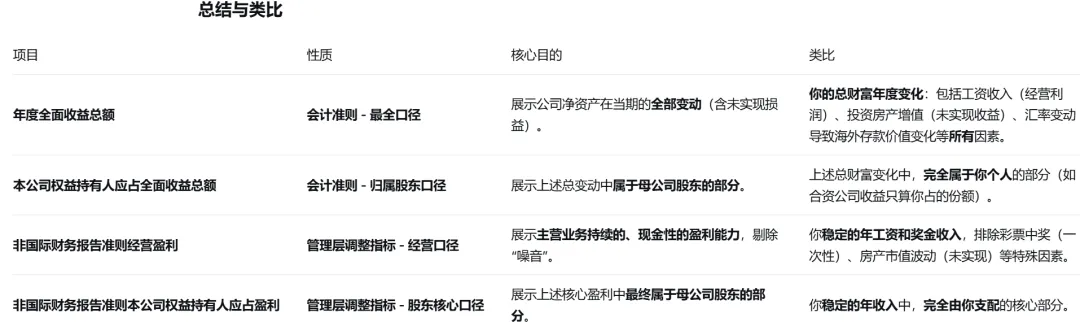 年度全面收益總額、本公司權益持有人應佔全面收益總額、非國際財務報告準則經營盈利、非國際財務報告準則本公司權益、持有人應佔盈利区别:
