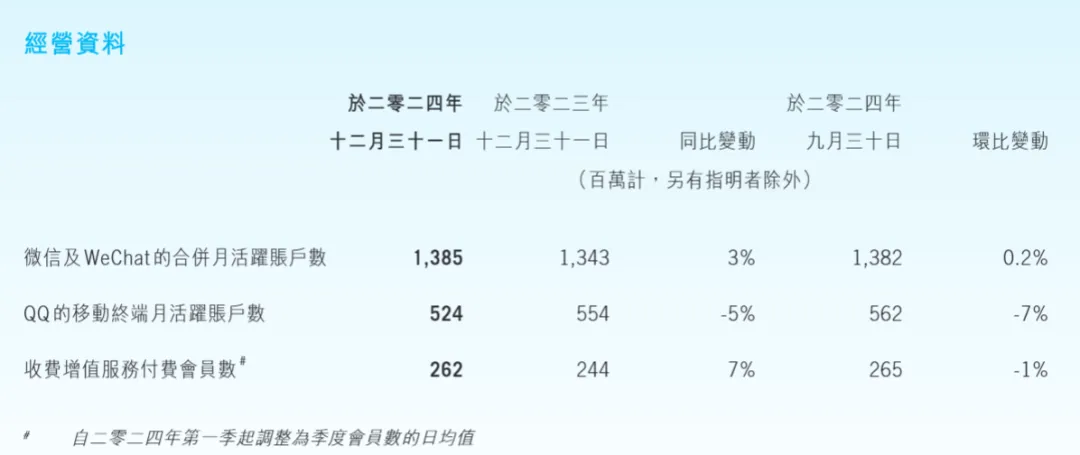 微信和WeChat合并月活跃账户 1385,000,000,即13.85亿,微增。QQ的移动终端月活服务数,524,000.000,即5.24亿,微跌。