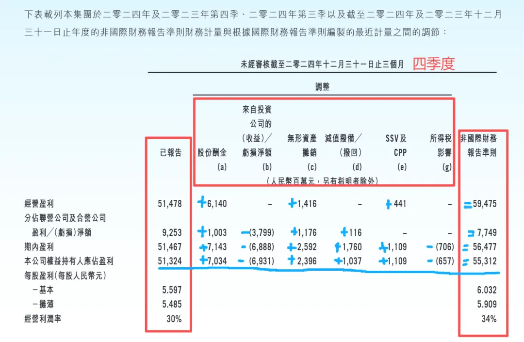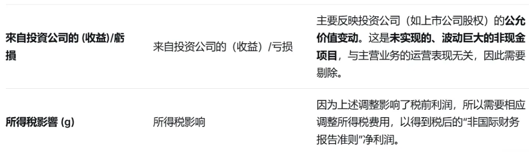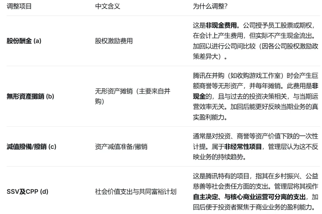 这张表格是腾讯控股 “国际财务报告准则(IFRS)与非国际财务报告准则(Non-IFRS)业绩调节表” 的核心部分。它的目的是向投资者展示,如何从官方会计准则(IFRS)下的利润数字,调整到管理层认为更能反映 “核心业务持续经营表现” 的“非国际财务报告准则”利润。