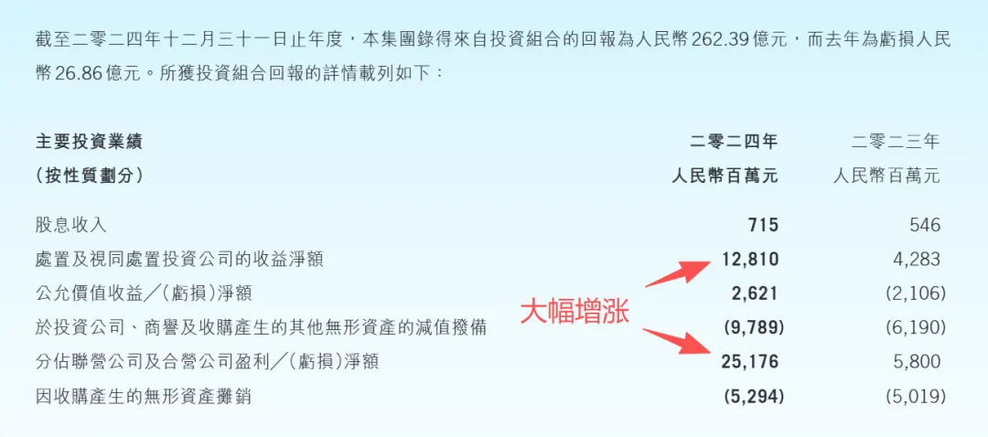 2024年,投资组合回报262.39亿人民币。2023年为-26.86亿。