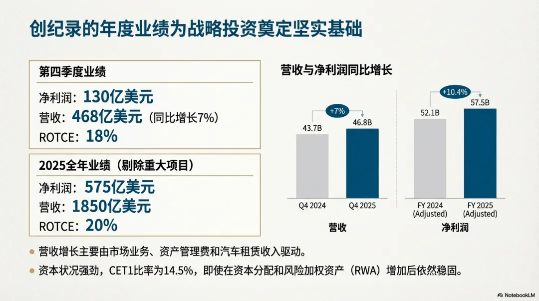 也正是在这一背景下,上周摩根大通发布了 2025 年第四季度财报。但这份财报真正值得细读的,往往不在报表数字本身,而在随后的财报电话会上:管理层如何解释当下业务的运行逻辑、如何判断竞争格局,以及他们准备把资源押注到哪里。