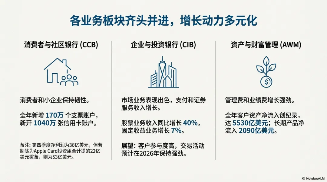 答案是:不是单一业务的运气,而是多业务结构的能力。摩根大通的盈利并非靠一个风口,而是来自三大板块的同步发力,这正是它被称为“金融综合体”的根本原因。