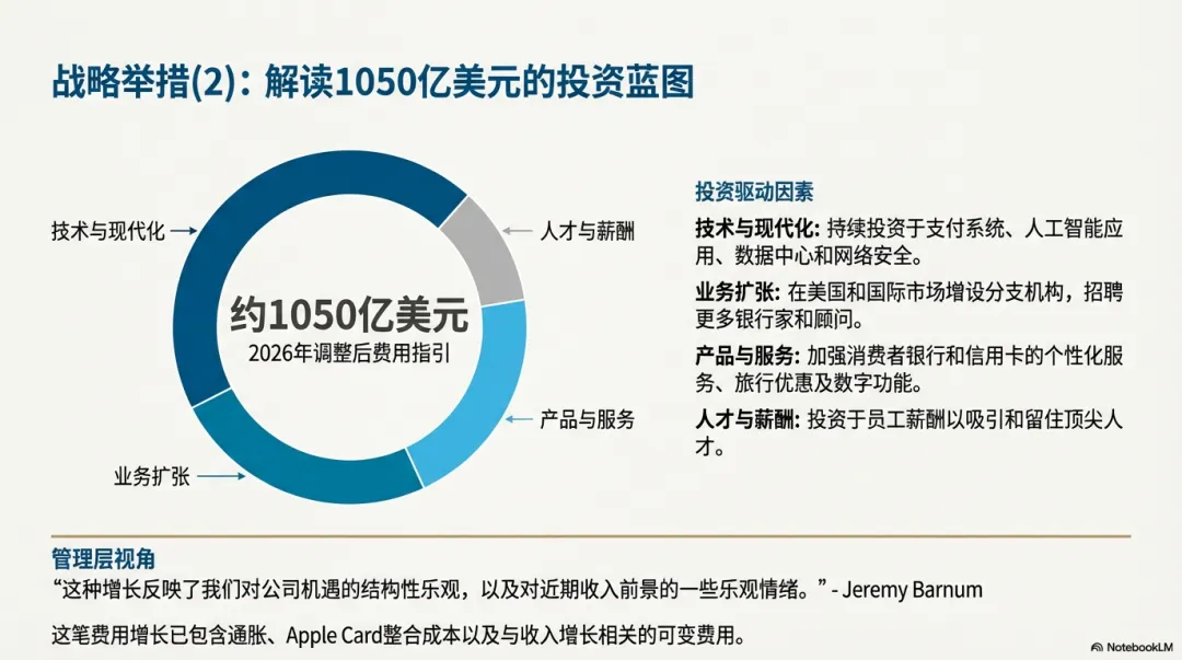 第二个下注更直接:真金白银的投入。会议给出 2026 年费用指引显著上调,增量达到数十亿美元级别。直觉上,这似乎不符合传统银行家“稳健控费”的审美,但管理层给了一个关键词:结构性乐观。
