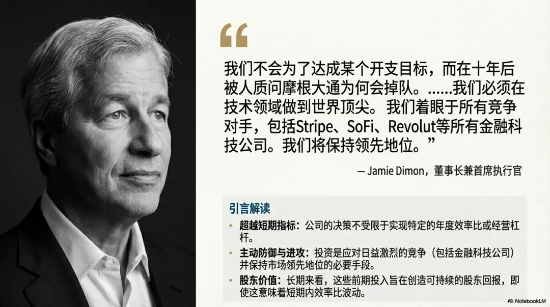 更值得玩味的是管理层对“竞争对手”的重新定义:他们不只盯着传统大行,还把 Stripe、SoFi 等金融科技公司摆上了同一张竞争地图。甚至明确表达了不希望十年后被追问“当年为何掉队”的担忧。对摩根大通而言,这笔额外投入本质上是购买一张通往未来的保险单,或者说一张领先门票:用今天赚到的钱,为明天的竞争准备弹药。