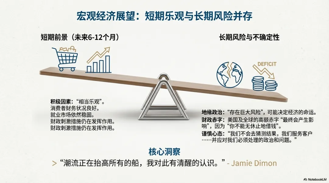 短期(未来 6–12 个月),支撑来自消费仍有余量、就业虽降温但尚可,以及此前政策效应仍在。长期担忧则集中在两块阴影:地缘政治风险与高额政府赤字。管理层强调不可能无止境借债的警告,显然是在提醒市场:短期繁荣不应掩盖长期约束。