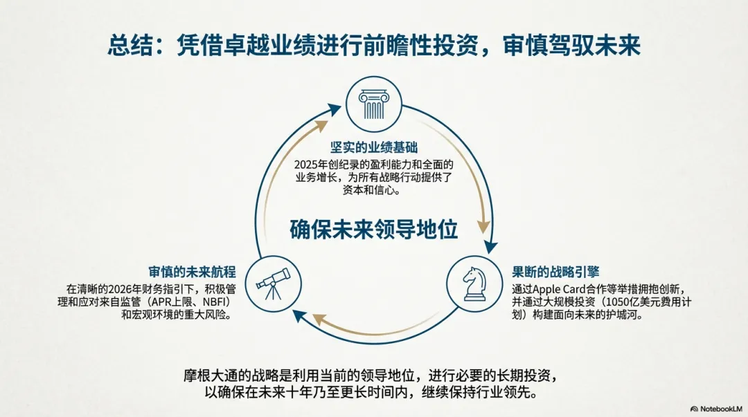 总结这场会议,你会看到一个更立体的摩根大通:它既是盈利能力极强的机器,也是一个对未来充满渴望与焦虑的组织;它一边通过 Apple Card 与技术投入主动进攻,试图抓住下一个时代;另一边又必须应对监管与宏观的不确定性,谨慎防守。