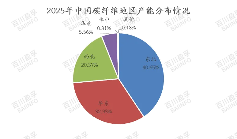 根据2025年中国各地区碳纤维产能分布情况,东北、华东及西北三个地区保持作为我国碳纤维的主要供应地区,合计占比93.96%。具体来看,东北地区产能不断扩张,本年度成为全国最大碳纤维供应地区,占比约40.65%,东北地区碳纤维产能集中度较高,主要集中在吉林省,产业一定程度上辐射到周边地区,如碳毡等生产企业主要聚集于此;华东地区碳纤维产能占比排名次之,占比约32.93%,华东地区碳纤维研究起步较早,形成“多点、多形式”发展的局面,产品类型丰富,下游衍生品较多;西北地区碳纤维产能排名为全国第三位,占比约20.37%,近年来因能源优势吸引部分企业投资,成为全国碳纤维主要生产地之一;华北地区碳纤维产能位列全国第四位,其占比约为5.56%,作为下游需求主要集中地之一,其产品供应整体发展脚步稳健;其他地区碳纤维产能占比相对较少,合计不足1%。
