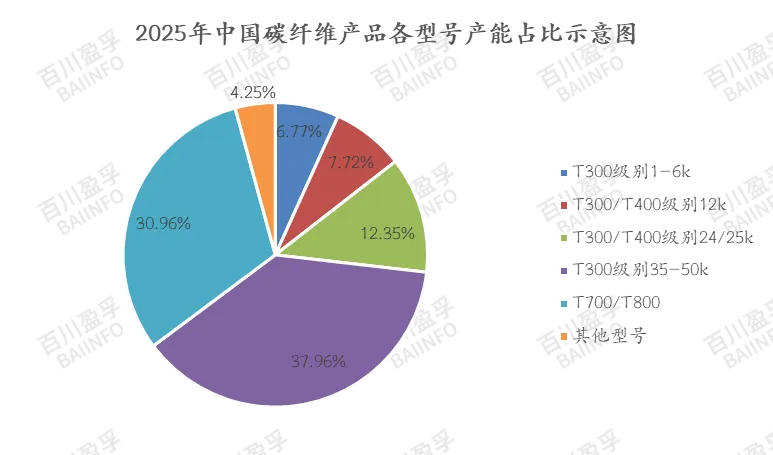 分型号来看,2025年我国碳纤维生产以T300、T700及T800级别为主。其中,生产T300/T400级别碳纤维产能约为104960吨,占比约为64.79%;生产T700/T800级别碳纤维产能约为50150吨,占比约为30.96%;生产其他型号碳纤维产能约为6890吨,占比约为4.25%。具体来看,受到低空经济需求拉动,国内部分产线以生产小丝束产品为主,另外国内企业逐步攻破高端体育休闲、航空航天等下游需求应用,T1000/T1100及M系列等产品生产增多。