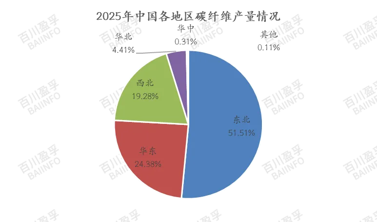 从中国各地区碳纤维产量占比来看,2025年各区域碳纤维产量与产能占比份额基本相符,主要为东北、华东、西北三大产能聚集地。具体来看,东北地区产能利用率相对较高,其产量位列前茅;华东地区柔性生产线较多,可切换生产,产品类型丰富,产量位列第二;西北地区产线技改升级,生产成本优化,全年开工相对稳定,年产量位列全国第三位。